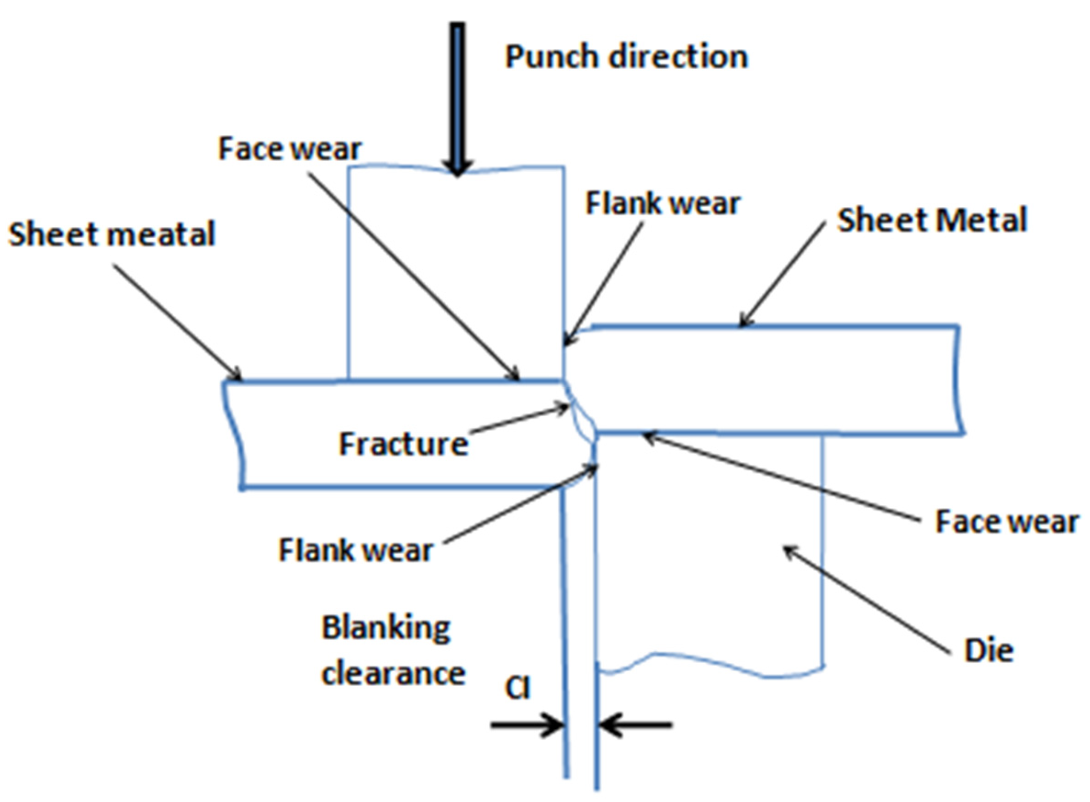 The effects of tool wear mechanisms have been investigated by many authors [1,2,3,4,5,6,7,8,9]. Taupin et al. defined four zones—rollover, shearing, fracture, and burr—to investigate the final part-edge geometry [2]. Maeda studied how to reduce die and punch wear and investigated the projected positive gap between the punch and the die [3].