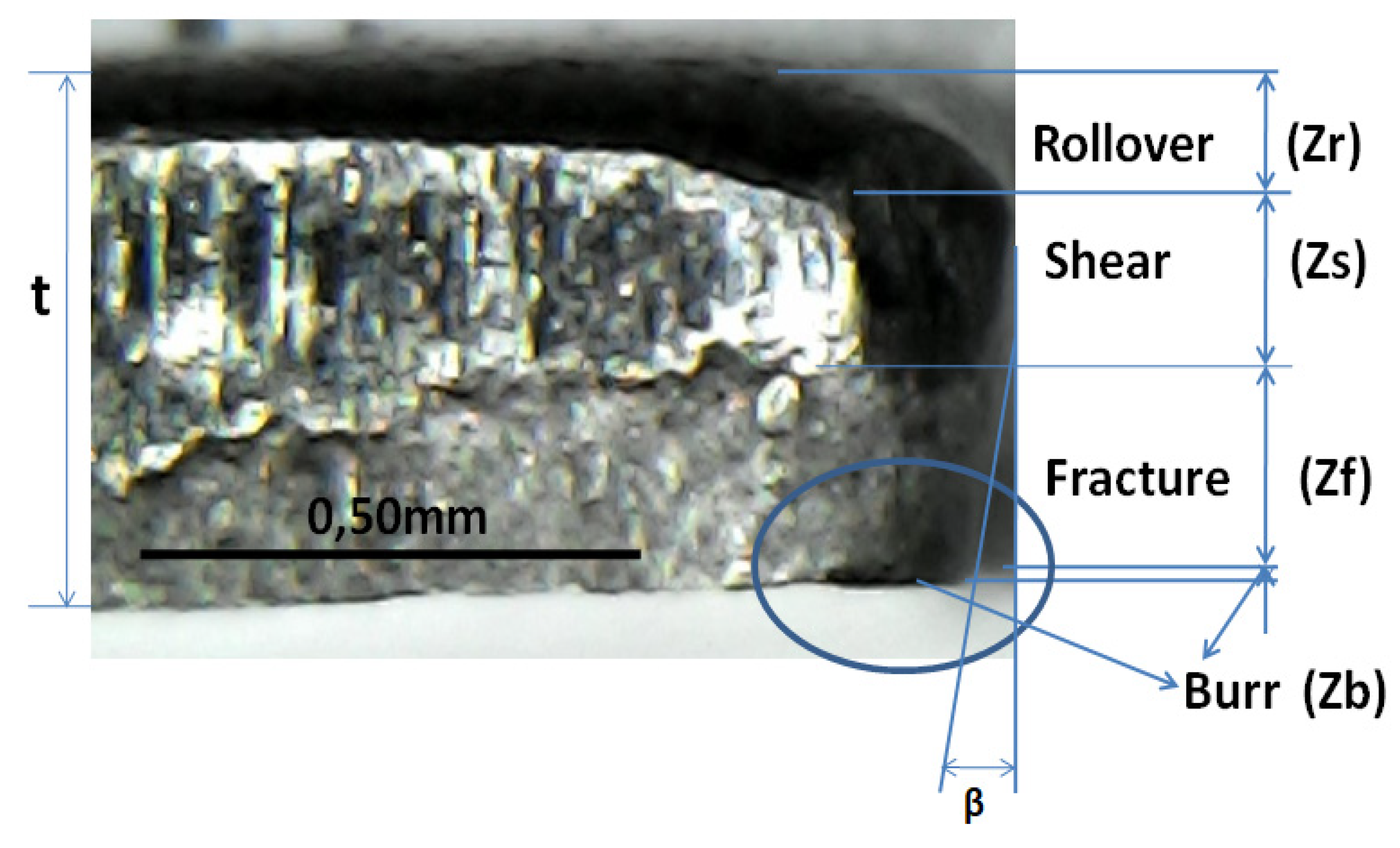 where Z r denotes the height of rollover, Z s   denotes the height of shear, and Z f   d e n o t e s the height of the fracture. By inserting t from Equation (1), one can obtain the clearance between the die and punch: