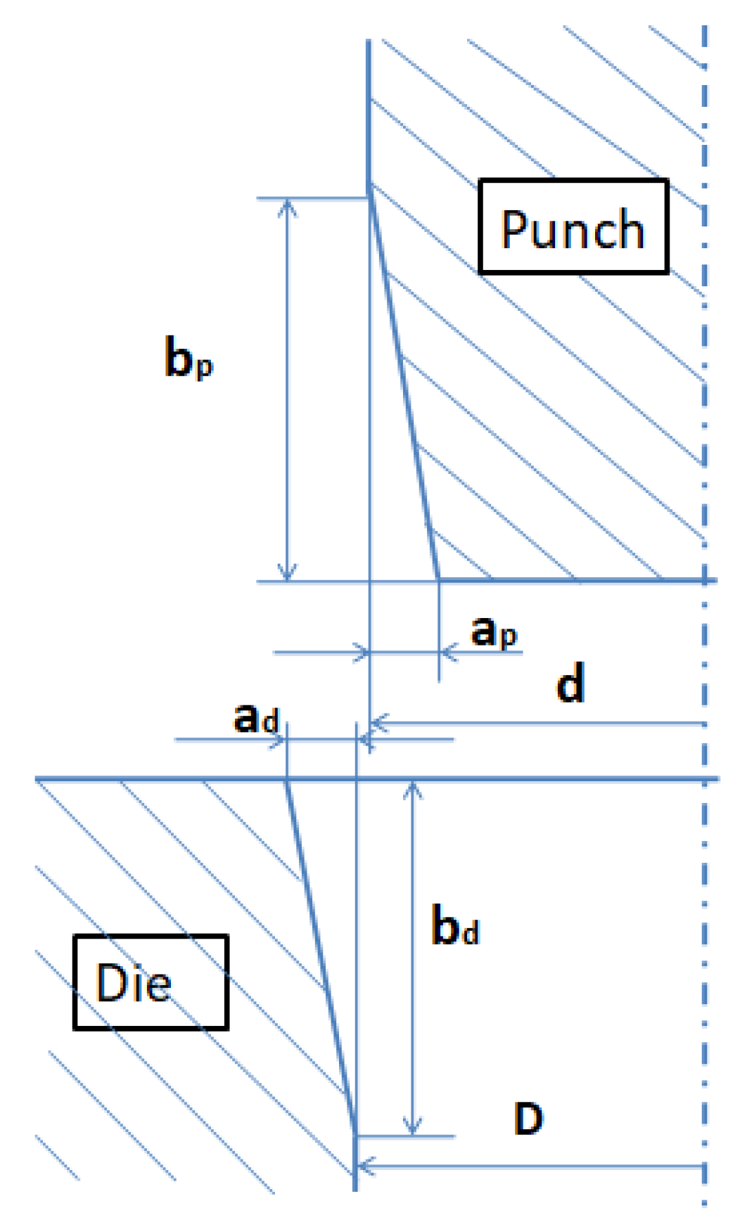 where the radial wear distance of the die is a d , the radial wear distance of the punch is a p , the axial wear length in the die is b d and the axial wear length in the punch is b p .