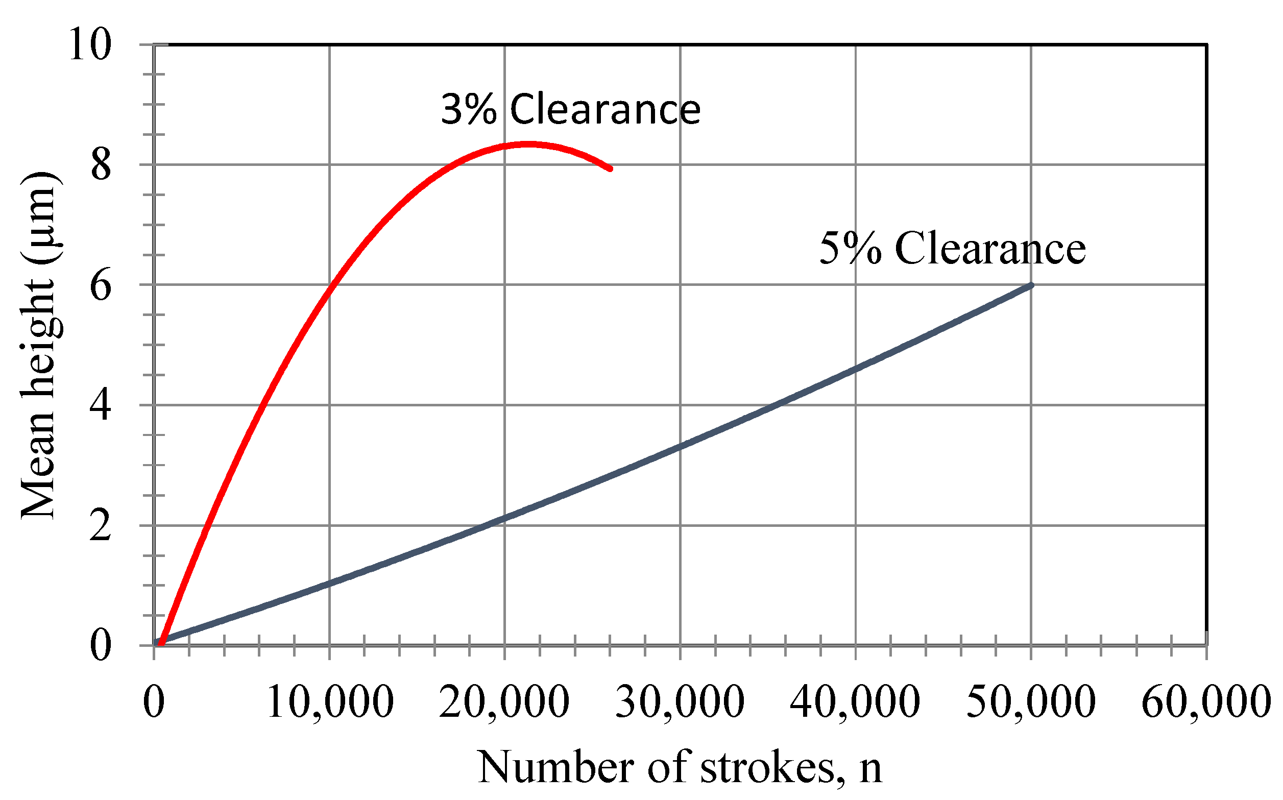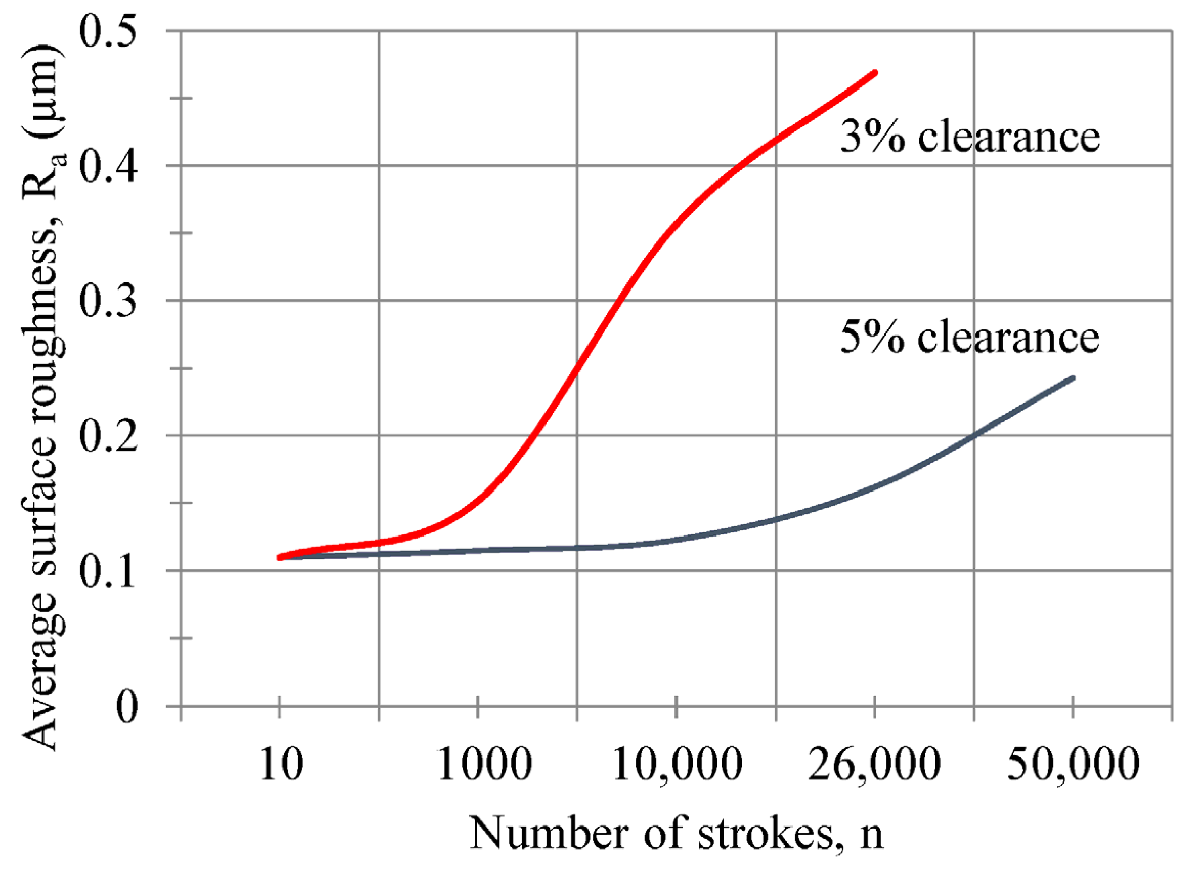 Because of the experimental study, it was found that the average surface roughness of the punch face could be calculated with the following equation, depending on the number of strokes for clearances of 5% and 3%:
