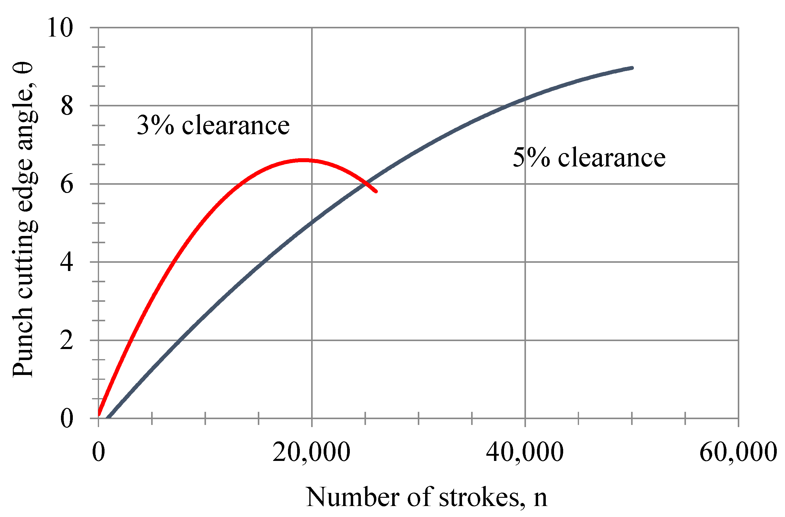 The change in the cutting-edge angle on the front surface of the punch, with respect to the number of strokes for both the 5% and 3% clearances, is shown in Figure 10. Because of the experimental study, it can be said that the one with 3% clearance has a higher cutting angle than the one with 5% clearance, and after 26,000 strokes, the one with 5% clearance shows a progressive increase. It was found that the innovative angle of the punch face could be calculated with the following equation, depending on the number of strokes for the 5% and 3% clearances: