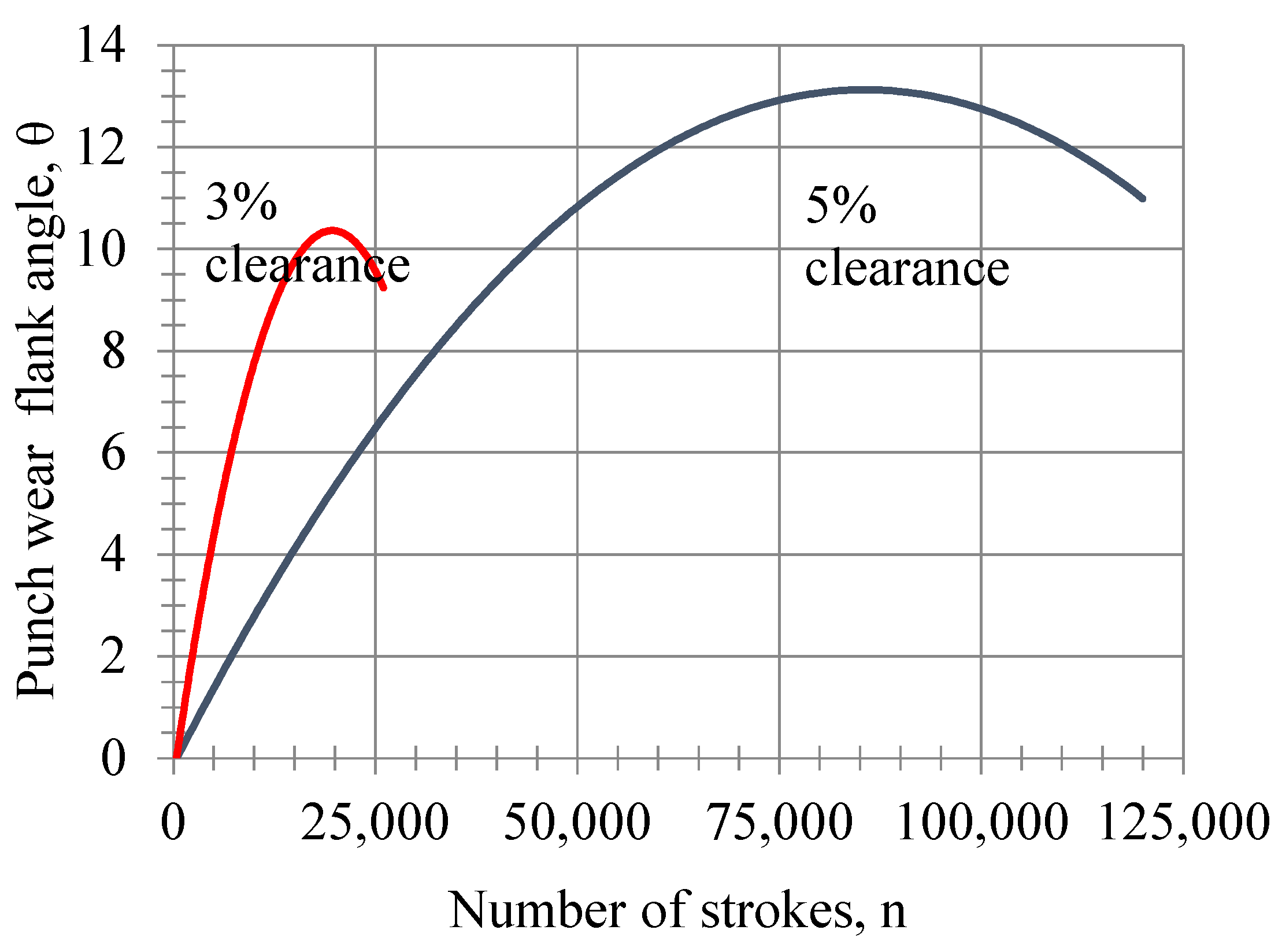 The variation of the wear flank angle with respect to the number of strokes at the end of the punch side face is shown in Figure 11. It can be clearly seen from this figure that the punch with 3% clearance has a higher wear flank angle than that with 5% clearance, and that the 5% clearance case shows a marked increase after 26,000 strokes. It can be seen that the wear flank angle of the punch flank face can be calculated with the following equation—depending on the number of strokes—for clearance values of 5% and 3%: