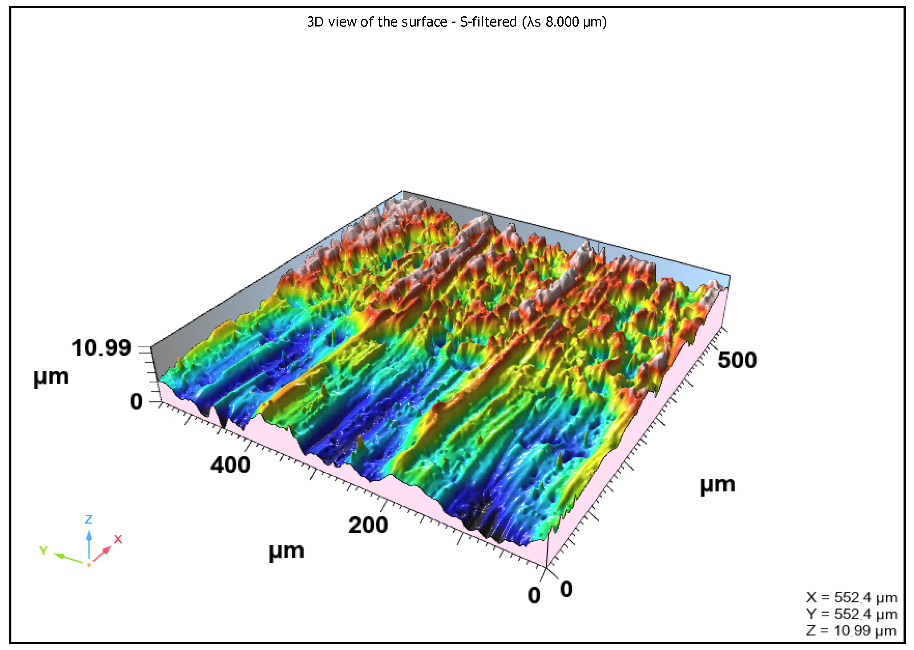 Figure 18. View of the punch-tip flank face bp wear length in 26,000 strokes by increasing the amplitude by 15%.(Surface roughness profile measured with a cut-off wavelength λs = 8 µm according to ISO 4287 [29]).