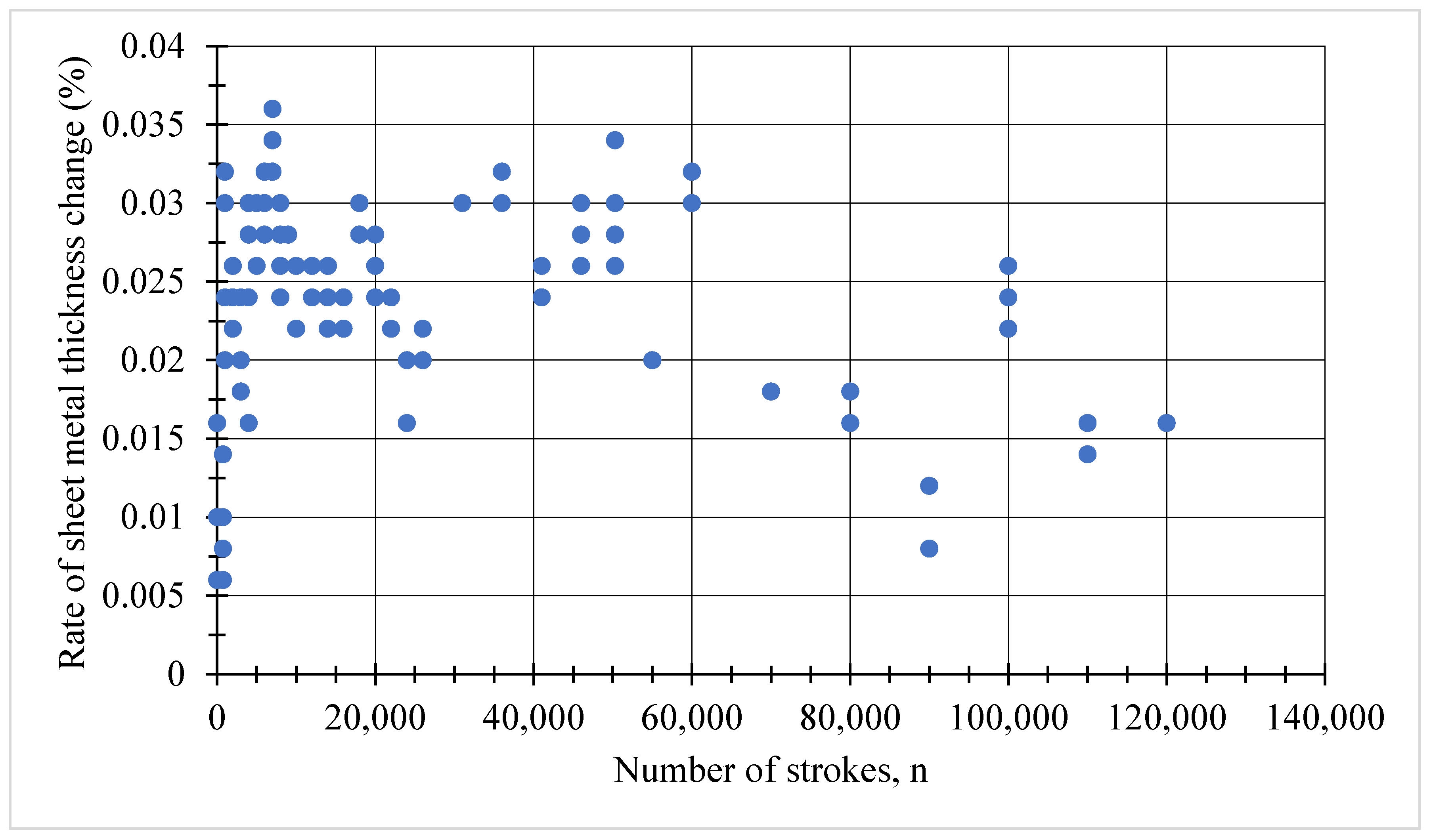 Figure 21. The rate of change of the 0.50 mm sheet thickness with respect to the number of strokes (An Insize 3109-25A digital micrometer (Insize Co., Ltd., Suzhou, China) was used as the measuring device).