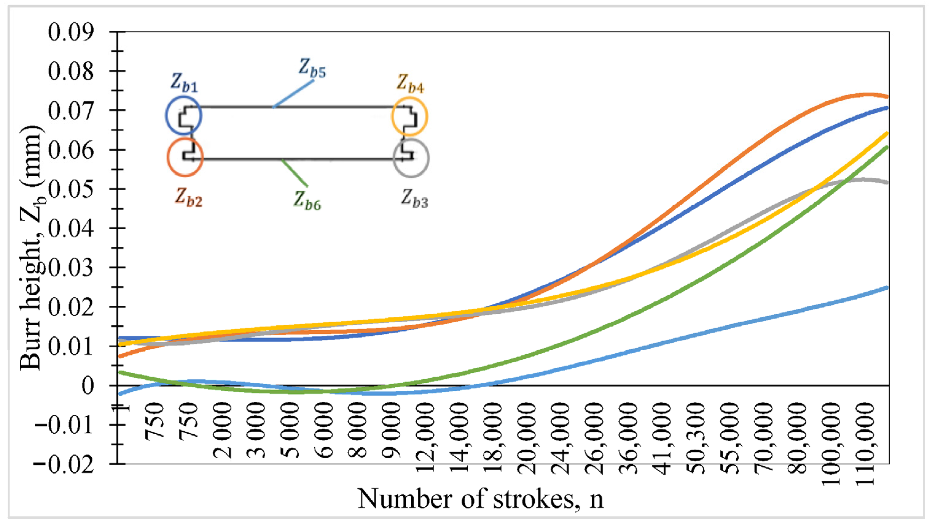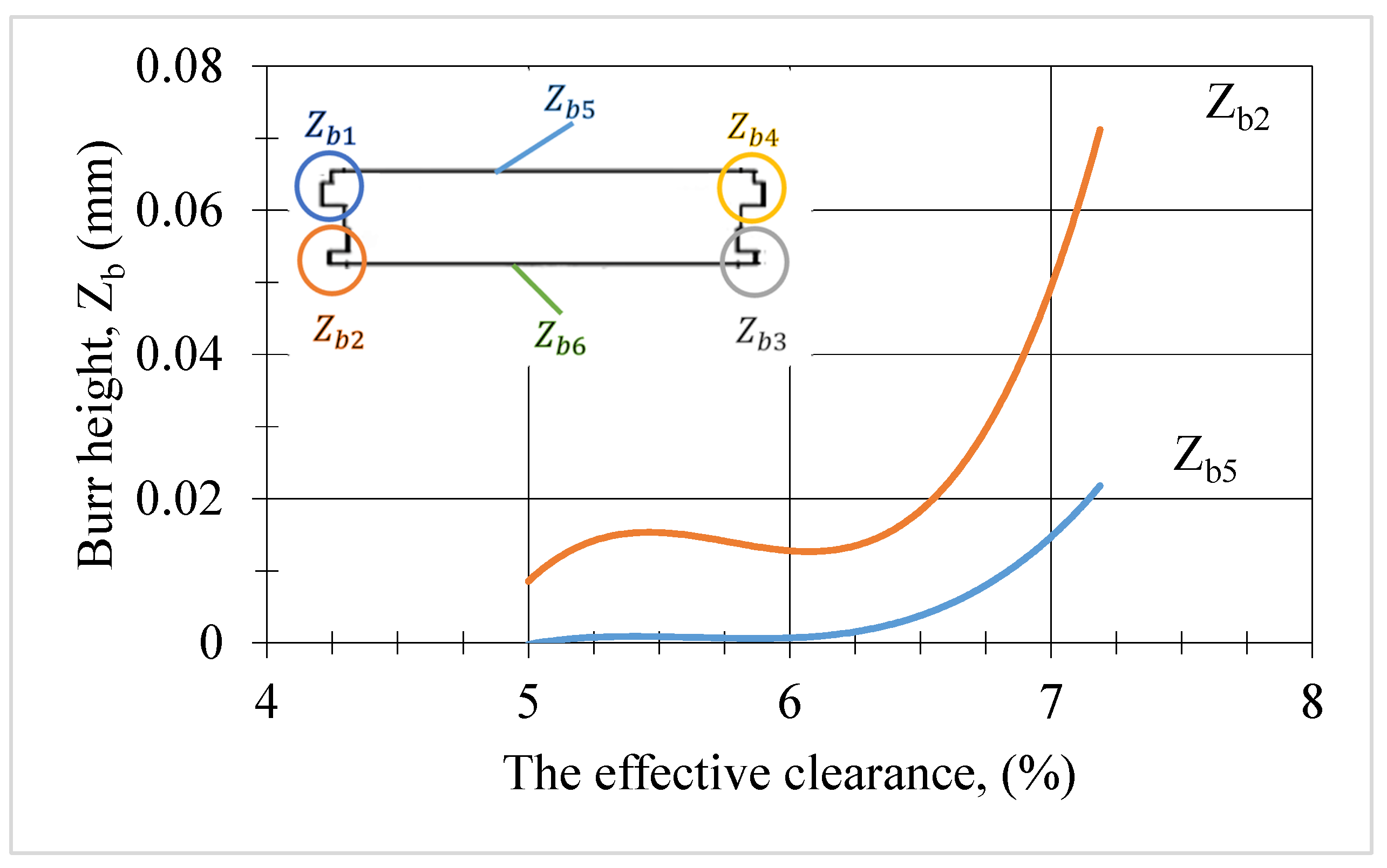 Figure 24. Relationship between the highest burr height, Z b 5 , the lowest, Z b 2 , and the effective clearance.