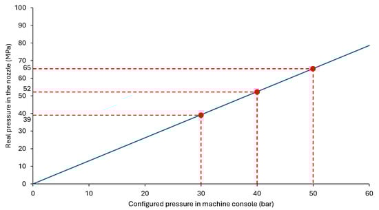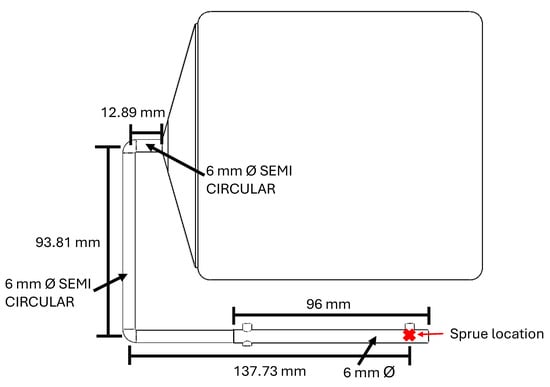 A Battenfeld TM 1000/525 injection molding machine with a closing force of 100 tons and a screw diameter of 35 mm was used to obtain the specimens. The injection pressure for all the samples was kept constant at 50 bar, adjusted directly from the machine console (equivalent to 75 MPa at the nozzle according to the conversion factor in Figure 1), and 1.65 s of injection time. The mold did not include an integrated thermal control or heating mechanism; therefore, its temperature was not actively regulated during the cooling stage. The absence of active temperature control could lead to variability in the measured mechanical properties, as reflected in the ANOVA. A constant cooling time of 30 s was applied in all cycles to ensure sufficient temperature reduction within the mold cavity before opening. The mold material was steel A36. The injected plate had dimensions of 140 mm × 132 mm and a 3.2 mm thickness, as shown in Figure 2. The fan injection gate in Figure 3 promoted a linear parallel direction of injected material along the principal axis, enabling the extraction of specimens with degrees of orientation to the injection flow as shown in Figure 4. The mold’s feeding system consisted of semi-circular runners with a diameter of 6 mm connected to a fan gate, as illustrated in Figure 5.