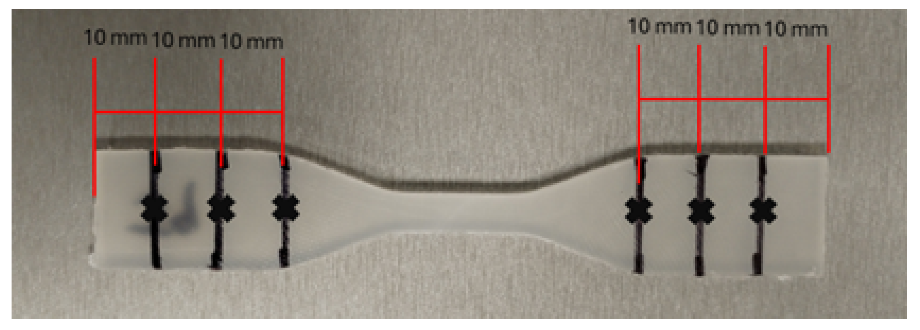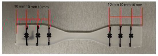 Location of measurements along the length of the tensile test specimen; each marking has a separation of 10 mm.