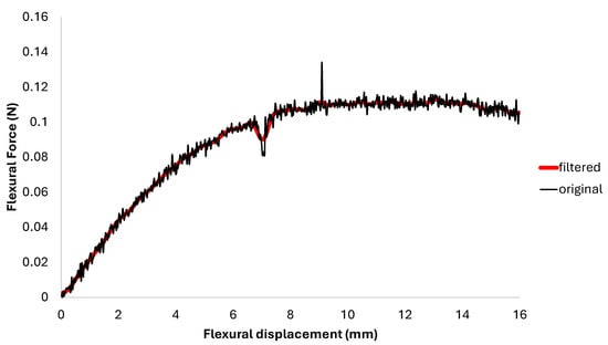 Due to the significant noise observed in the experimental bending load data, a low-pass filter implemented in Python was applied to prevent incorrect data interpretation. The filter parameters were manually tuned to 2 Hz (cutoff frequency), 50 Hz (sampling rate), and a filter order of 4 to obtain a smooth curve without offsetting the initial data. Figure 10 shows how the filtered data overlap with the original data.