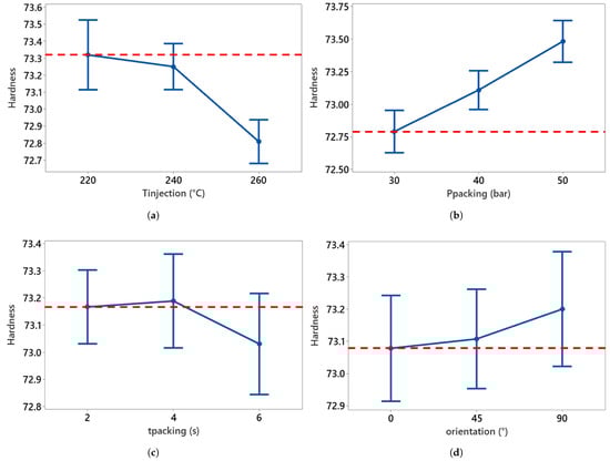 Main effects plots of hardness versus process parameters are shown. (a) Injection temperature vs. hardness, (b) packing pressure vs. hardness, (c) packing time vs. hardness, and (d) orientation vs. hardness. The dotted red line is the reference value.