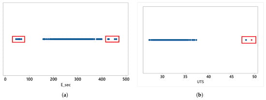 The resulting standard deviation values shown in Figure 14a for and Figure 14b were no longer considered outlier-driven after these removals. Because is a dependent variable of UTS, it was not included in the outlier analysis.