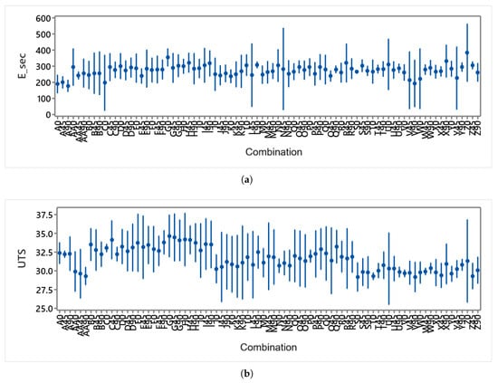 According to an outlier test for the and UTS measurements, combinations Y12, C7, and N12 were removed because of extremely low values (Figure 13a). The X18 and R12 samples were removed for showing abnormally high UTS values (Figure 13b).