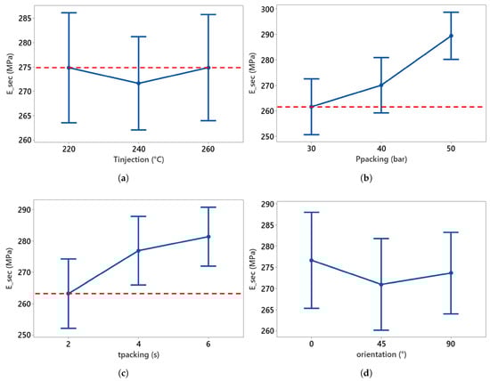 According to the main effect plots in Figure 12a, increasing the injection temperature from 220 °C to 260 °C reduced the warpage. This can be explained by the higher temperature allowing the cavity to fill evenly, reducing the areas with different temperatures and reducing uneven cooling and shrinkage—ultimately lowering warpage. In Figure 12b,c, the effects of the packing pressure and packing time were not significant due to a high variability.