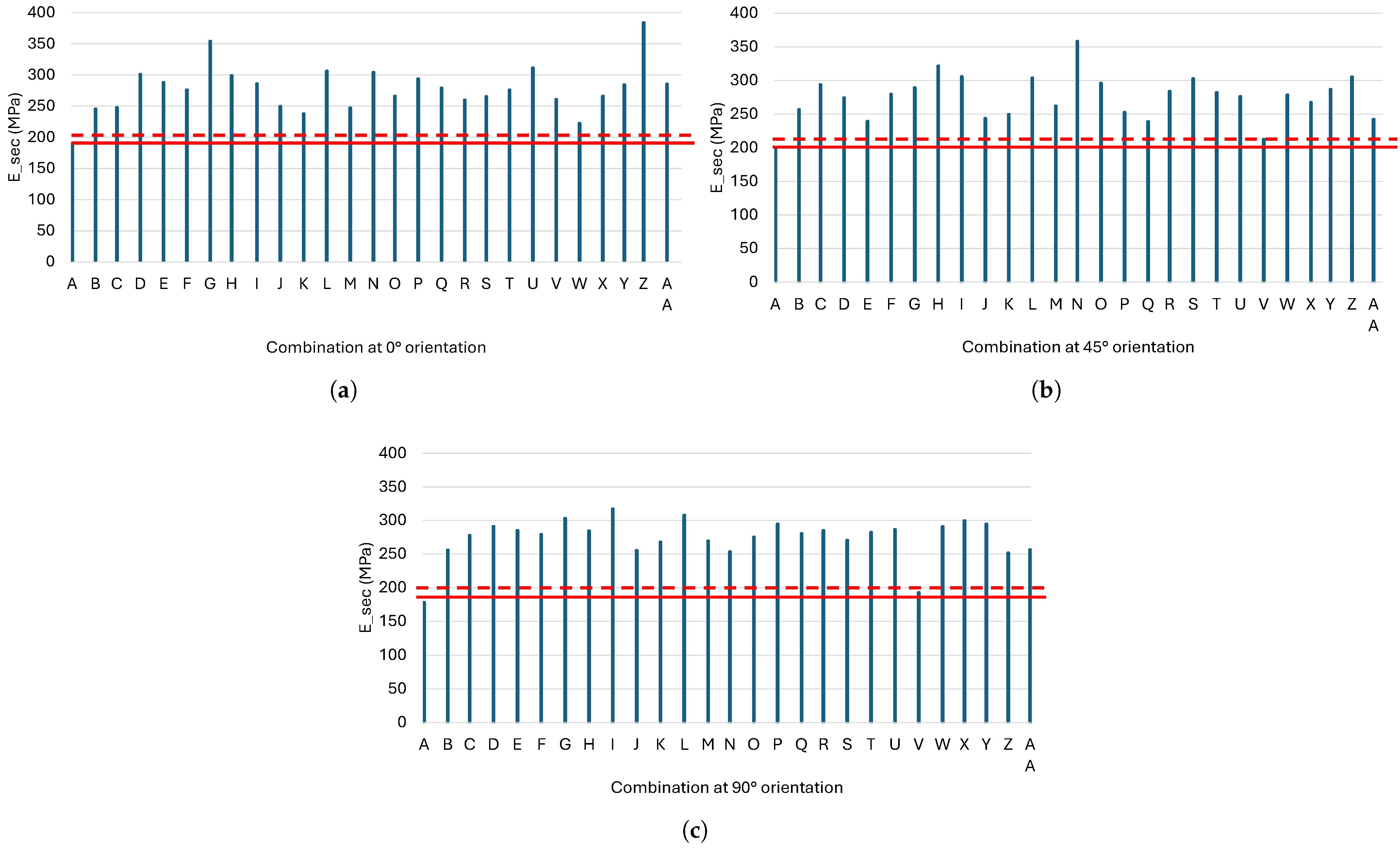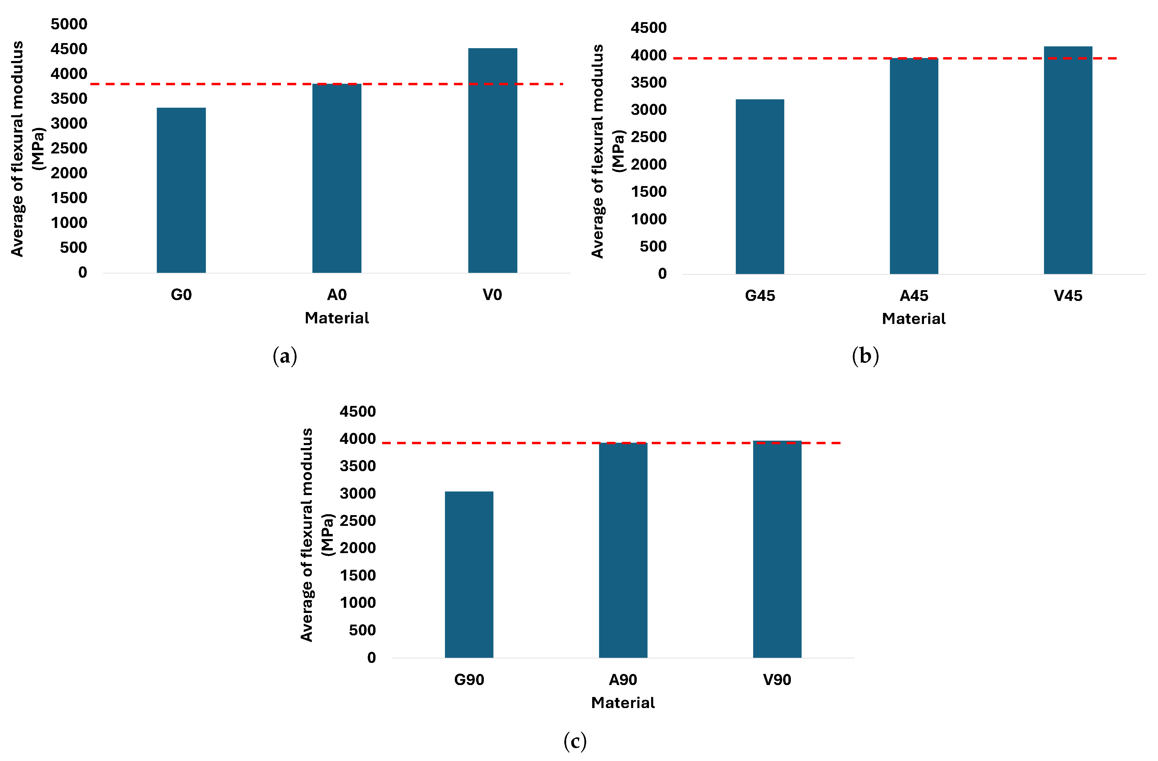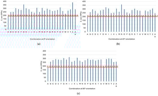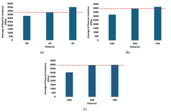 Average flexural modulus for the best, reference, and worst combination under the three main orientations compared to the reference (dotted red line). (a) 0° orientation, (b) orientation, and (c) 90° orientation.