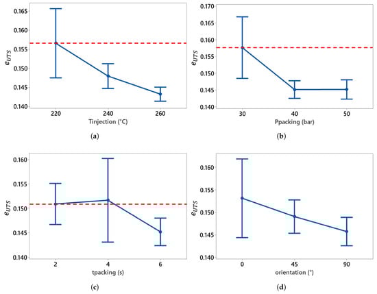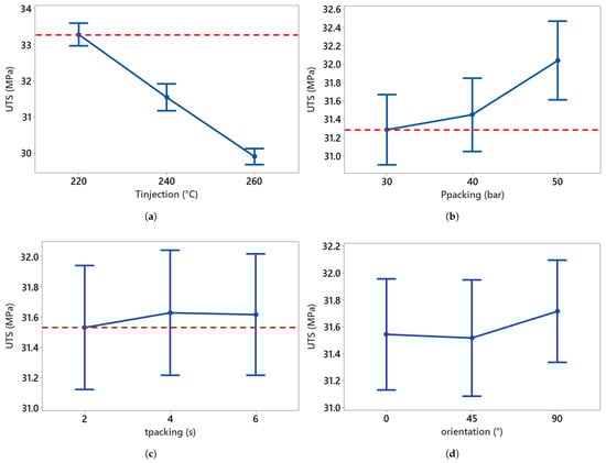 The UTS increased with the packing pressure from 40 to 50 bar, as shown in Figure 19b. Compressing the material at approximately 85% of the injection pressure improved its mechanical strength, consistent with the findings of Mehat et al. []. increased slightly from 2 to 4 s, but no additional changes were observed thereafter.