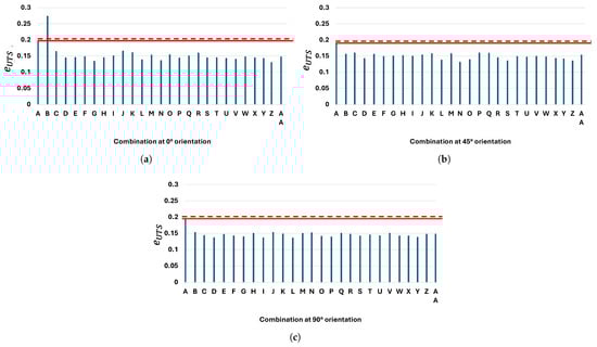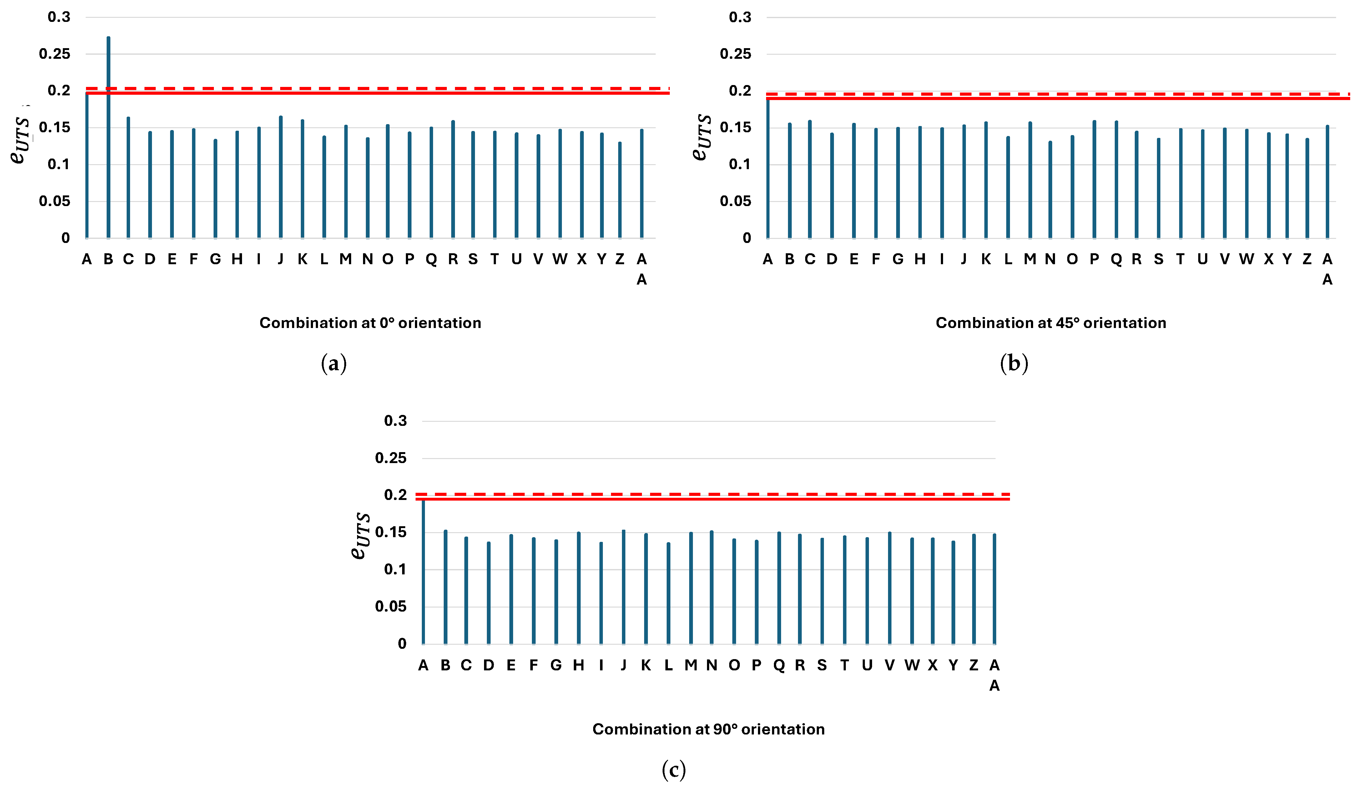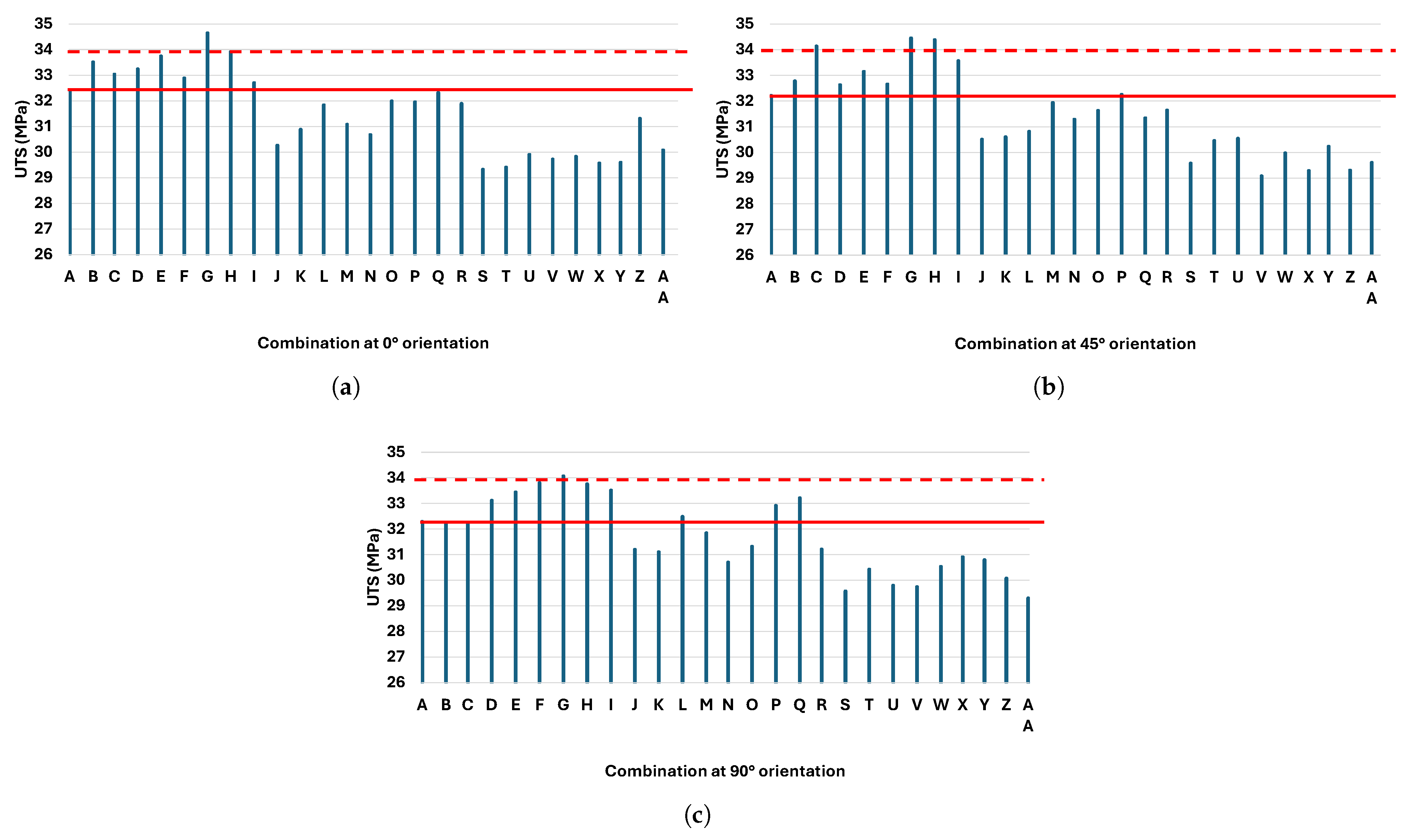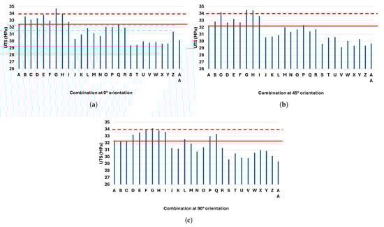 Comparison of the UTS of the reference combination (red line) with the UTS value of all combinations for the three main orientations: (a) 0°, (b) 45°, and (c) 90°. The dotted line equals 1.05 times the reference value.
