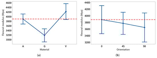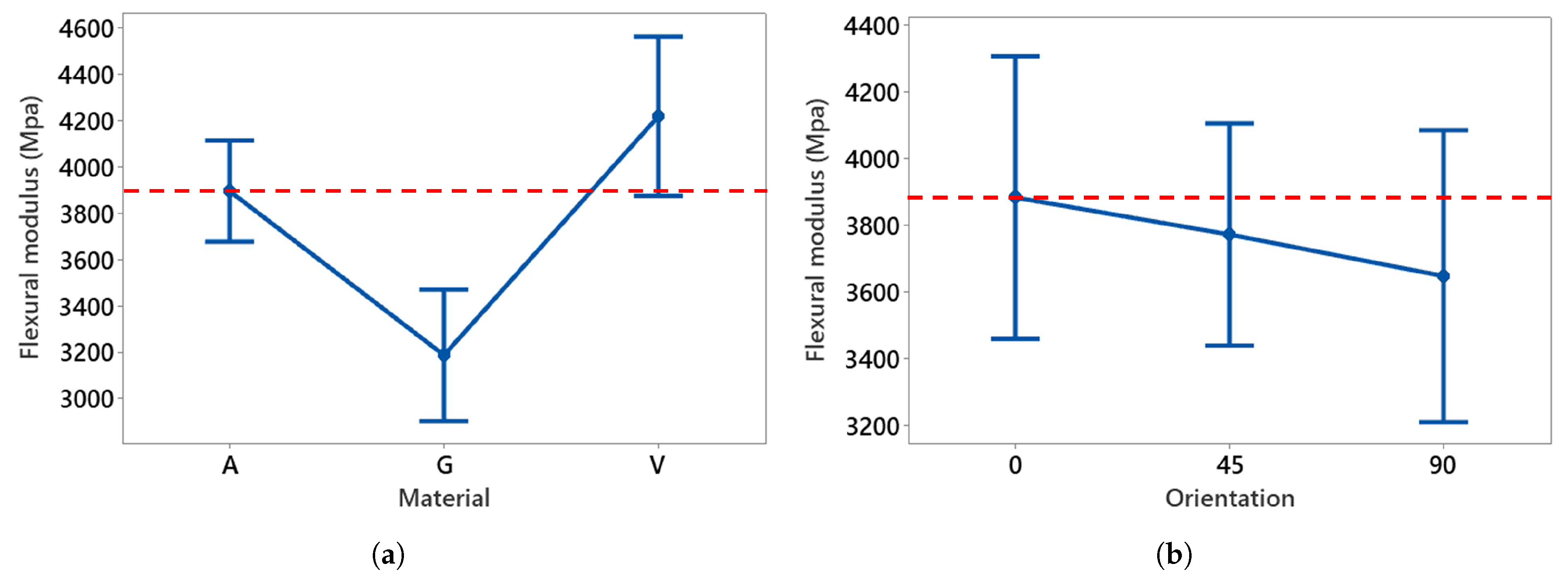 Main effect plots of (a) material and (b) orientation on flexural modulus compared to reference (dotted red line).