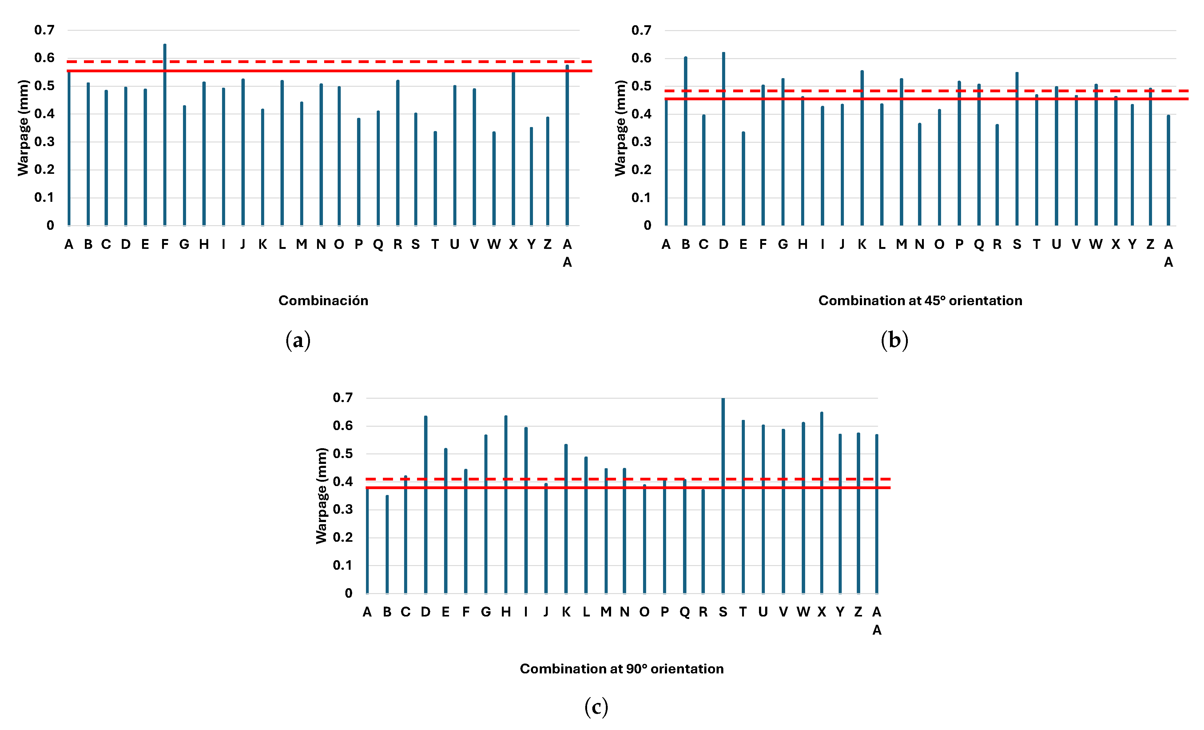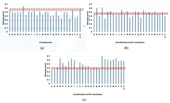 Comparison of the warpage of the reference combination (red line) with the warpage value of all combinations for the three main orientations: (a) 0°, (b) 45°, and (c) 90°. The dotted line equals 1.05 times the reference value.