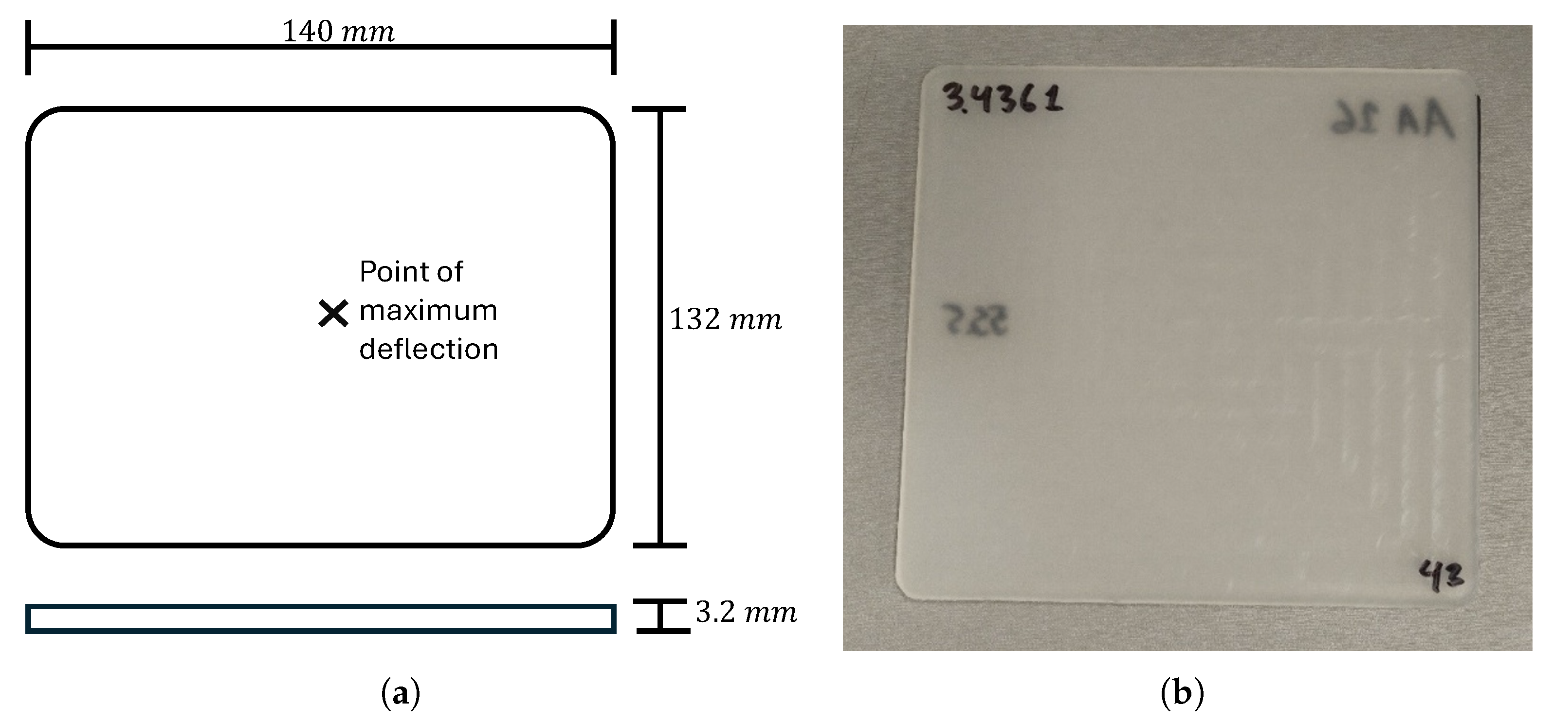 Dimensions of the specimen plate obtained from injection molding and point of maximum deflection; (a) CAD design, (b) plate for measurement.