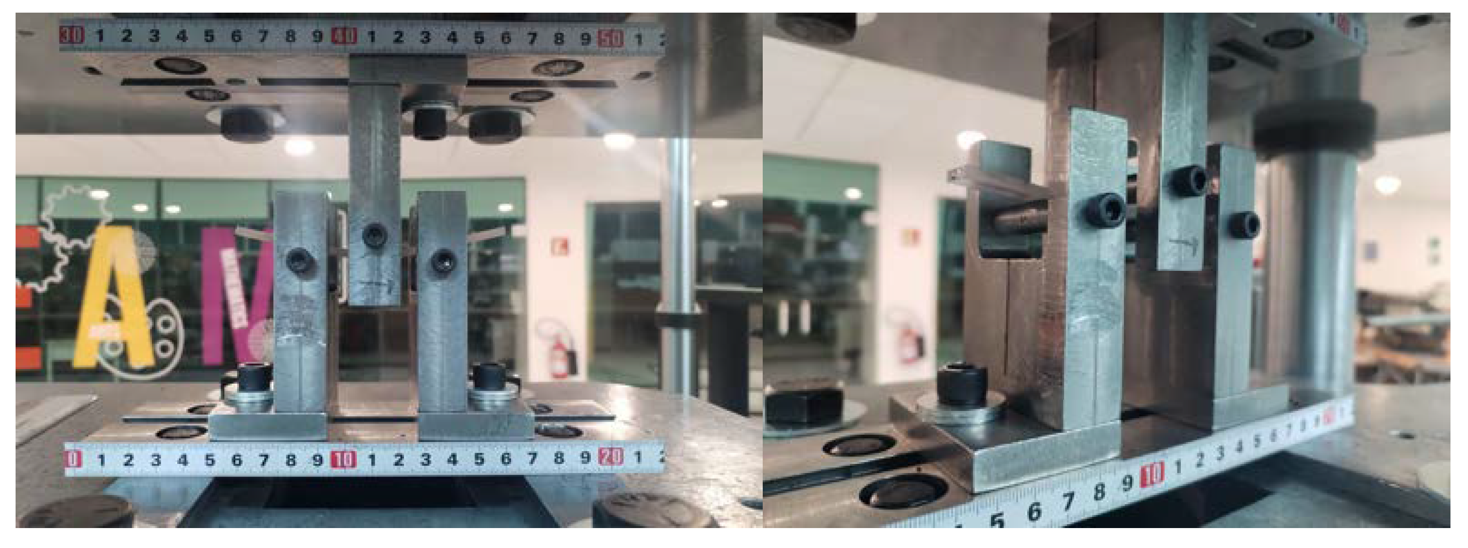 Three-point bending flexural test device. Frontal view; isometric view.