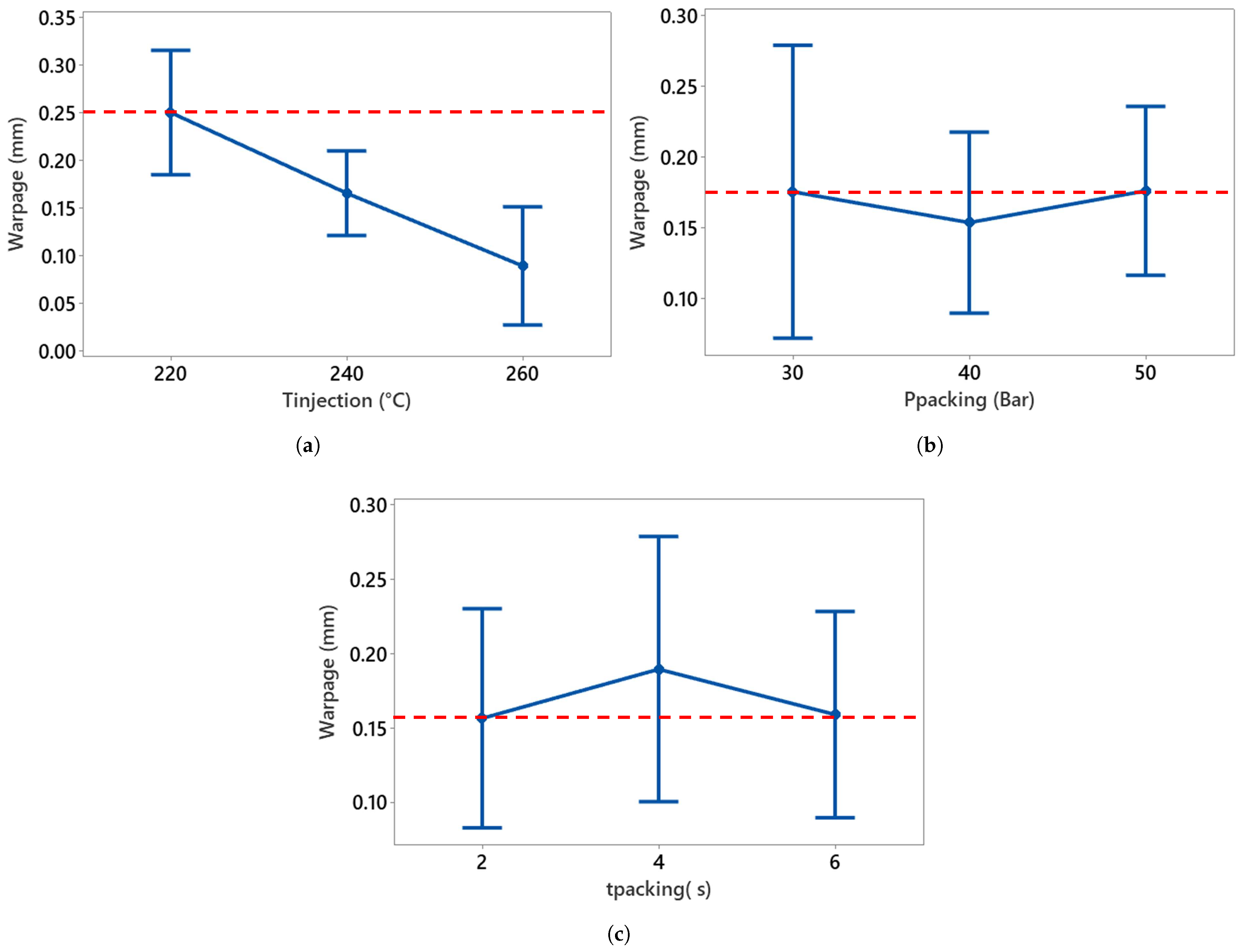 Main effects of process parameters on plate warpage. (a) Injection temperature vs. warpage, (b) packing pressure vs. warpage, and (c) vs. warpage. The dotted line is the reference value.