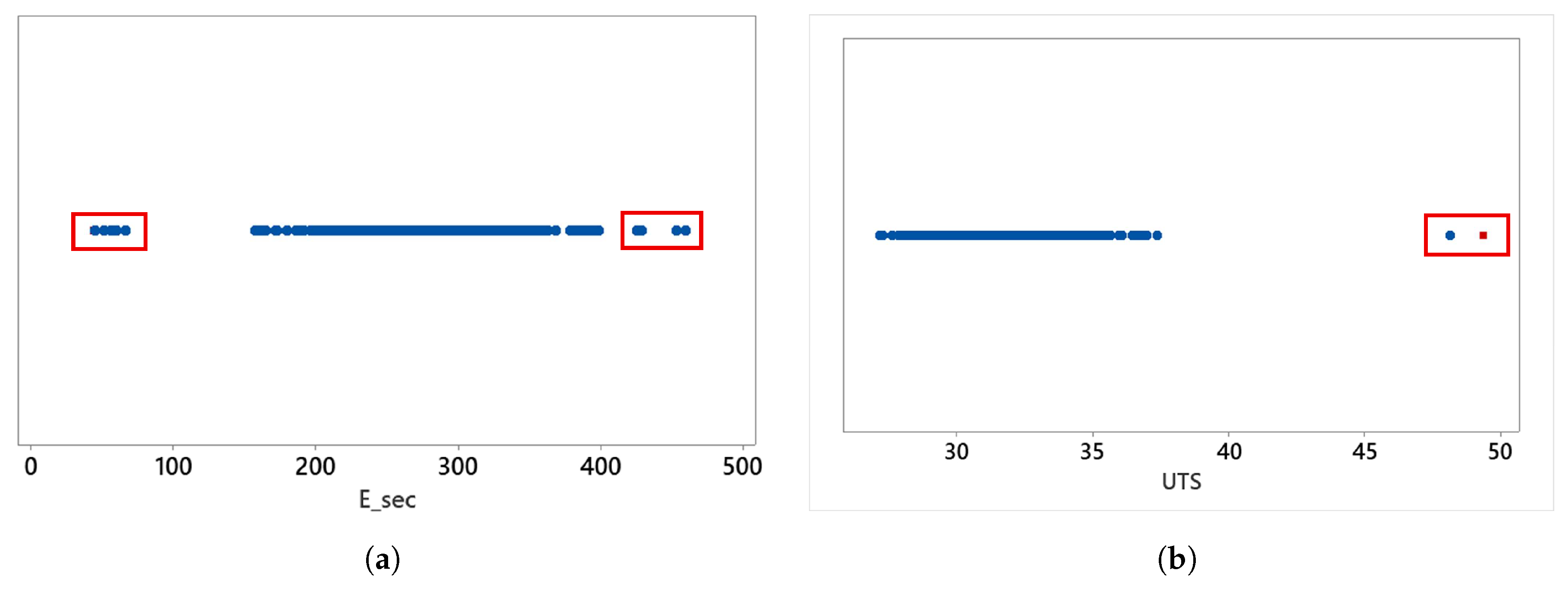 Outliers for all samples (a) and all UTS samples (b). The red square box represents the reference value, with scattered dots indicating the results for and UTS, respectively.