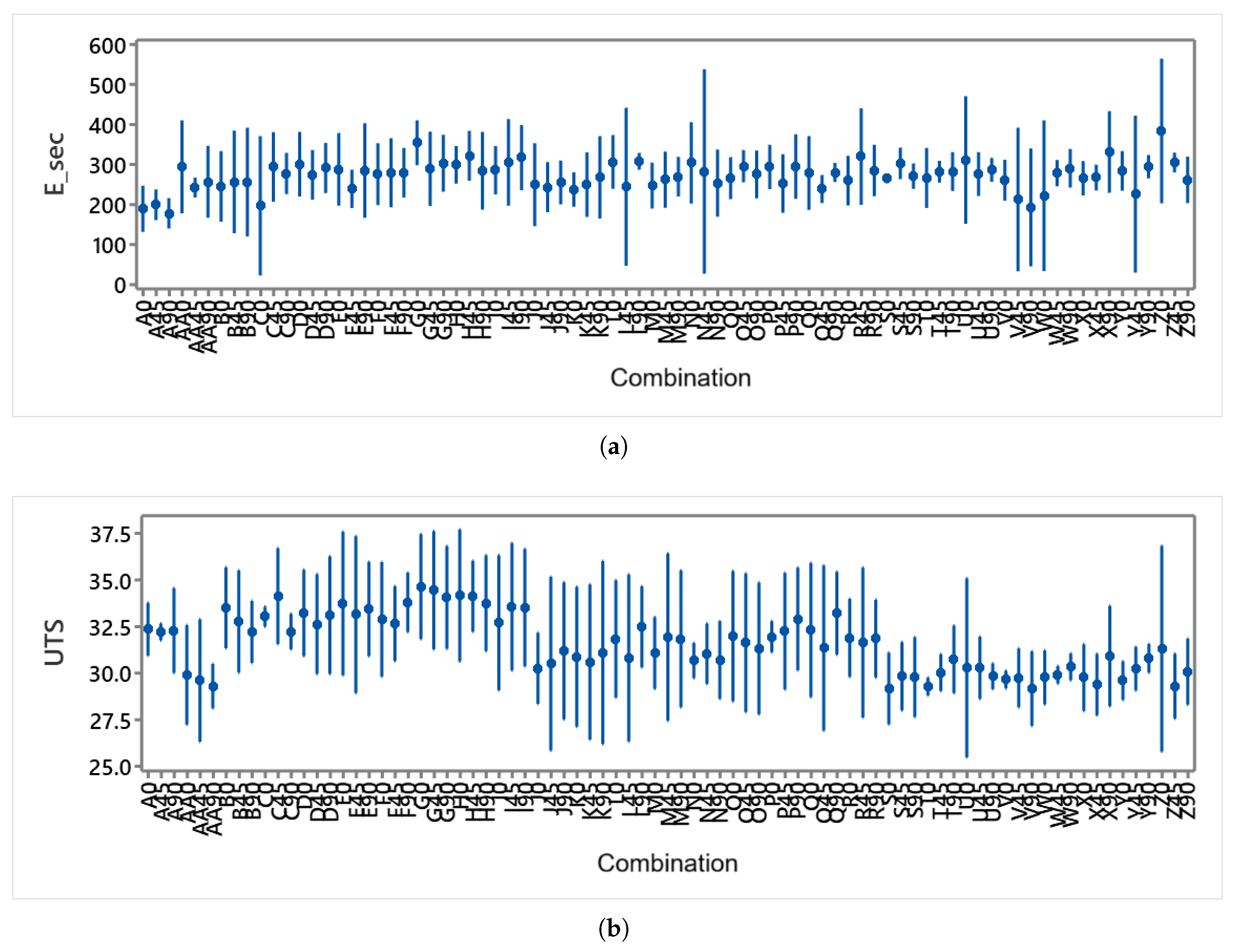 (a) Range of values for each combination of parameters and orientation. (b) Range of UTS values for each combination of parameters and orientation. Outliers removed.