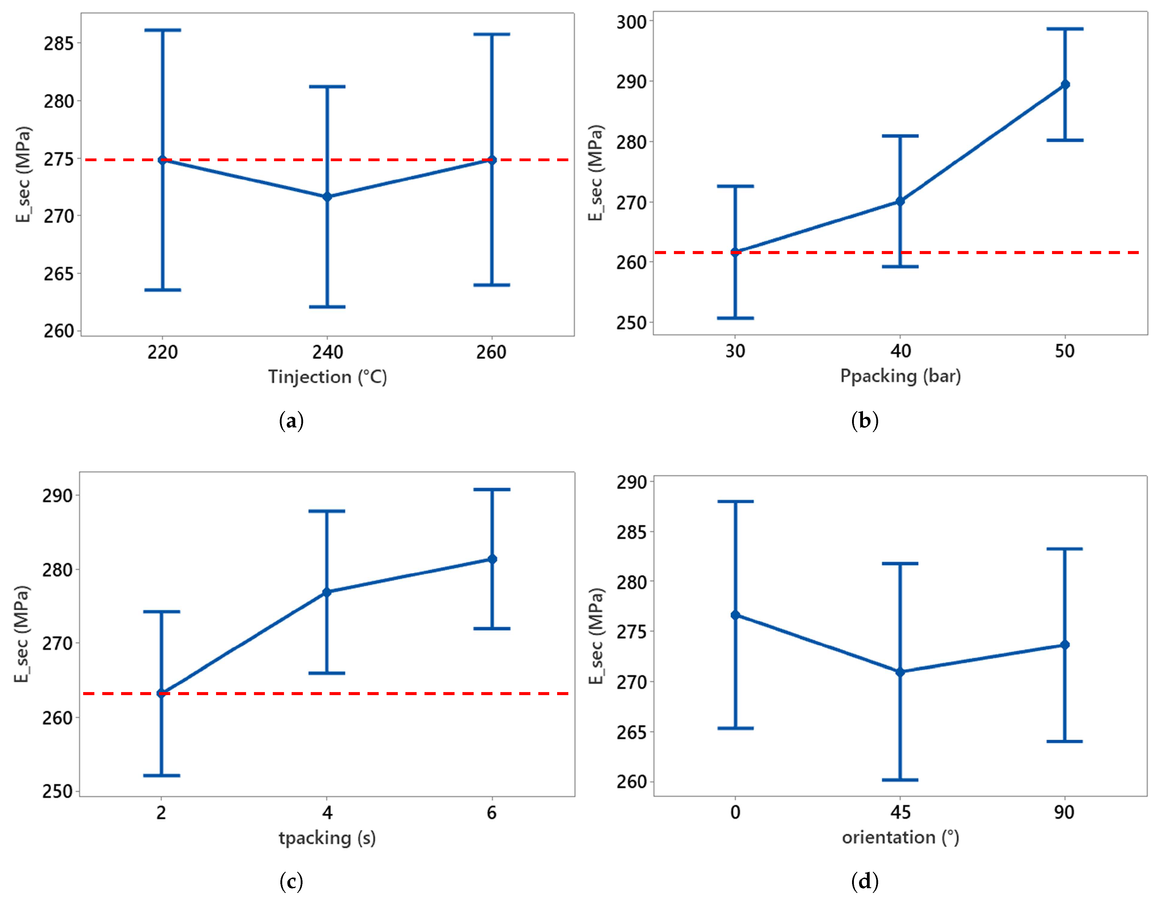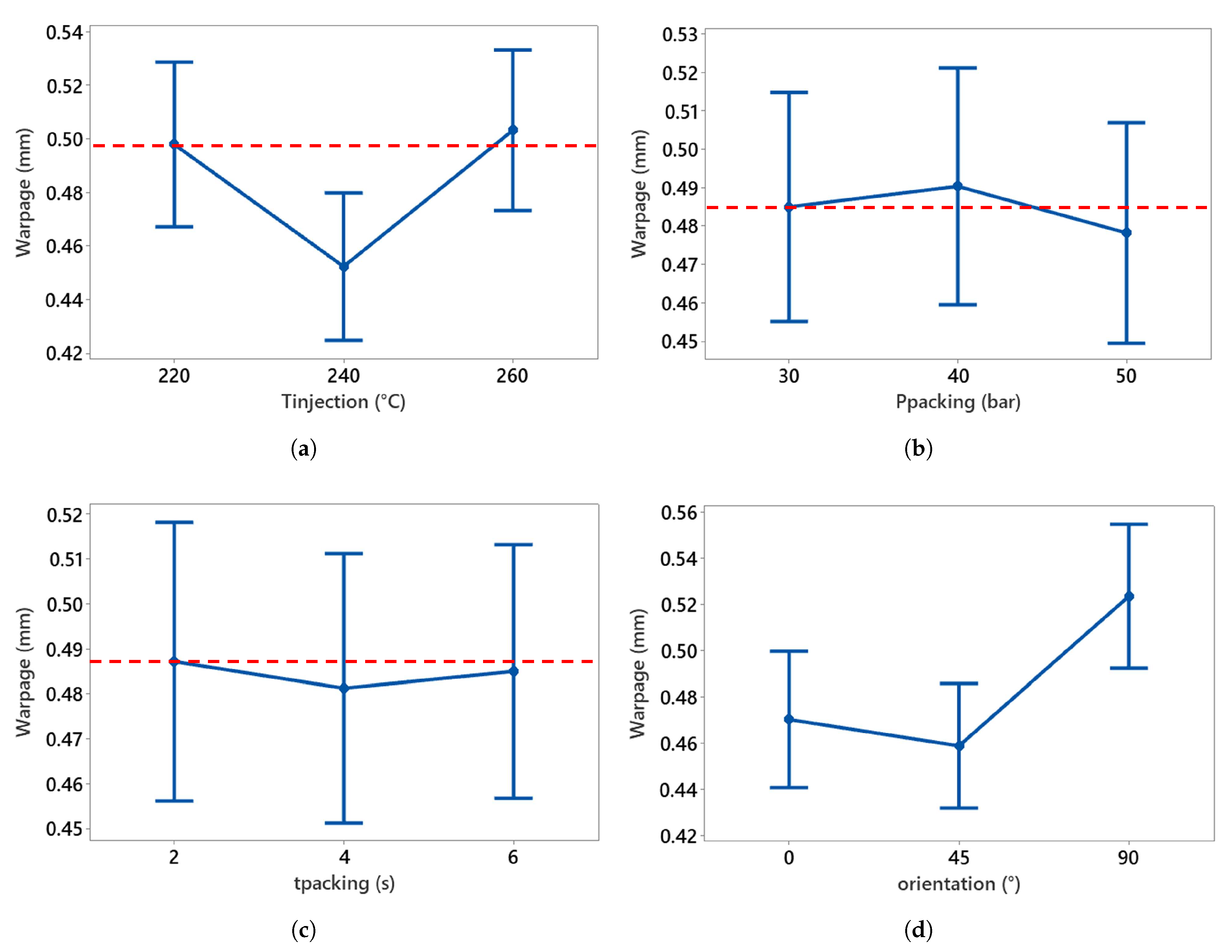 Main effect plot of warpage with process parameters. (a) Injection temperature vs. warpage, (b) packing pressure vs. warpage, (c) packing time vs. warpage, and (d) orientation vs. warpage. Reference is the dotted red line.