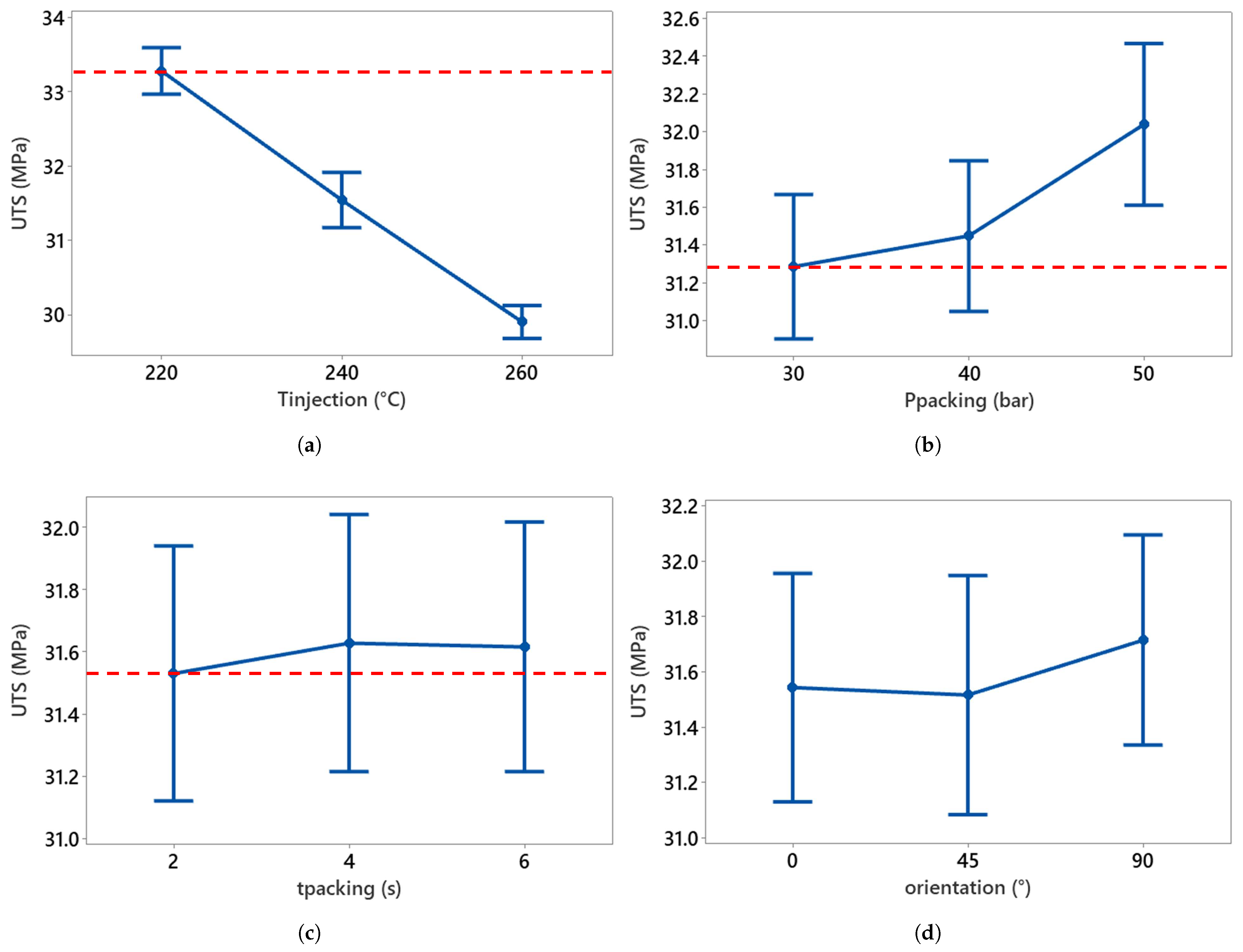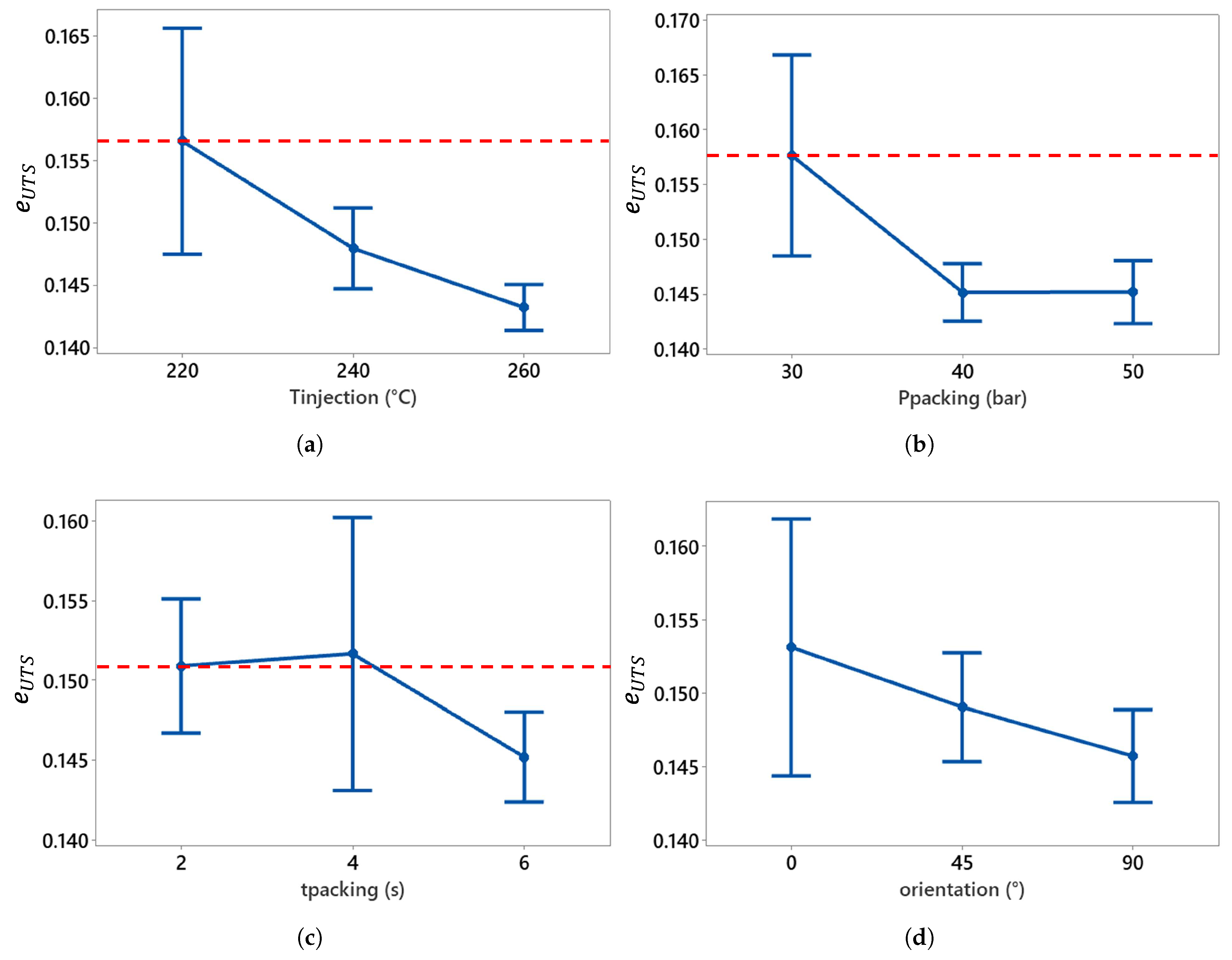 Effect of injection parameters on strain at ultimate tensile strength compared to the reference (dotted red line). (a) , (b) , (c) , and (d) orientation.