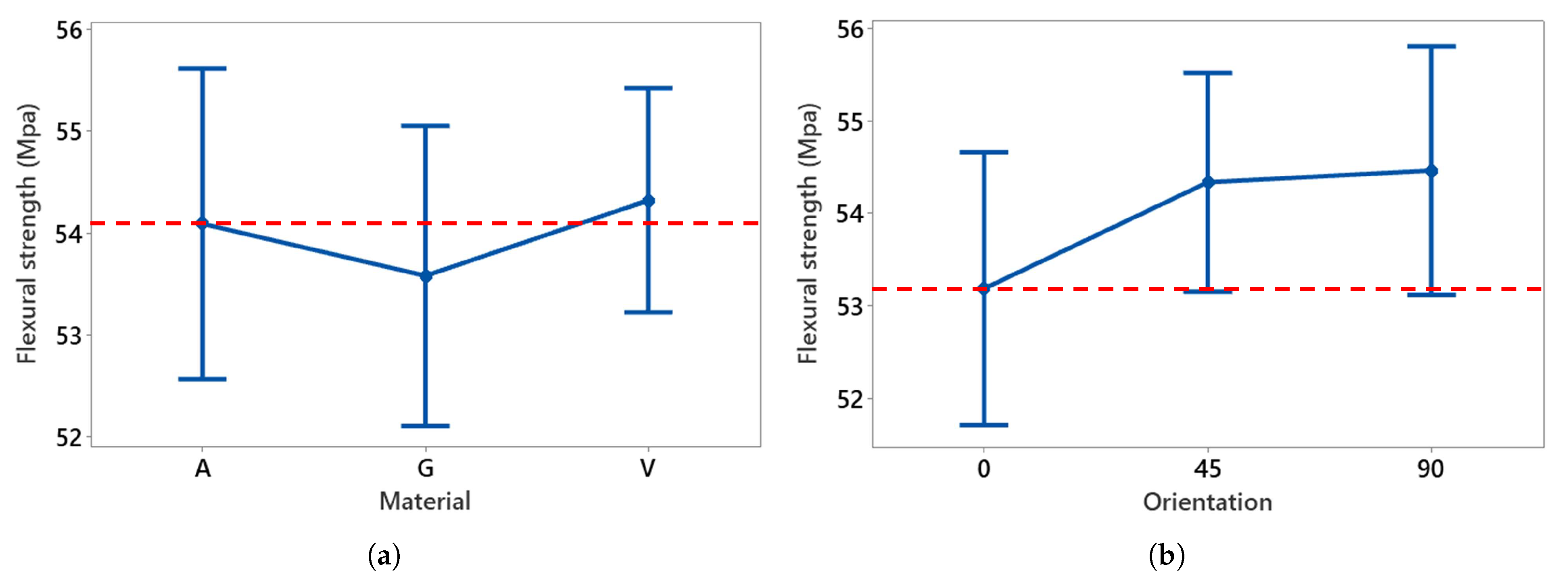 Main effect plots of (a) material and (b) orientation on flexural strength compared to reference (dotted red line).
