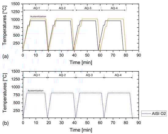 Figure 2 shows the austenitizing and quenching cycles applied for each tool steel. These cycles were repeated from one (AQ-1) up to four times (AQ-4) using a muffle furnace controlled by a TC51 temperature controller. The label “AQ-0” is used to indicate the annealed conditions (i.e., without any austenitizing and quenching cycle).