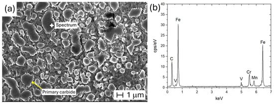 Figure 3a shows the microstructure of AISI O2 steel in the AQ-0 state (i.e., annealed conditions). The SEM micrograph reveals a homogeneous distribution of primary, relatively large carbides formed during steel production. According to the EDS spectrum in Figure 3b, these primary carbides contain Fe and the main alloying elements of AISI O2: Cr, Mn, and V. Similar findings were discussed by []. The high Fe peaks are attributed to the signals originating both from the carbide and from areas of the matrix underlying the carbide.