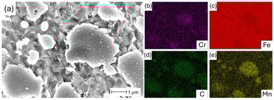 The secondary carbides formed within the AISI O2 matrix are shown in the high-magnified micrograph in Figure 4a. These fine carbides were likely formed during slow furnace cooling. The EDS maps indicate that the carbides are composed primarily of alloying elements such as Mn and Cr. In contrast to the primary carbides shown in Figure 3b, the carbides in Figure 4b exhibited no detectable traces of V.