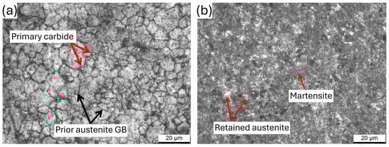 Microstructures of AISI O2 tool steel after the AQ-2 thermal cycle: panel (a) highlights primary carbide and prior austenite GB, panel (b) displays martensite and retained austenite.