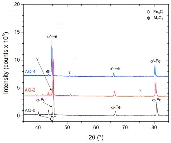 The XRD patterns in Figure 6 illustrate the microstructural variations that occurred during multiple quenching cycles of AISI O2 tool steel. In the AQ-0 state, AISI O2 exhibited M7C3 carbides containing Cr and Mn alloying elements (Figure 3b and Figure 4b–e), which were dispersed within a ferritic–pearlitic matrix. The absence of the M4C3 carbide type at diffraction angles of approximatively 36° and 63° confirms that V-related peaks in Figure 3b are the signal originating from the matrix underlying the carbide (Figure 3a). On the other hand, the carbides containing the V element may be so few in number that their signal is not detectable. Due to the slow furnace cooling of the AQ-0 state, the Fe3C-related peaks may be attributed to the presence of pearlitic structures, as similarly discussed in []. During the AQ cycles, the Fe3C carbides were completely dissolved into the austenitic phase. As a results of the same diffusion processes, the intensities of M7C3-related peaks decreased from AQ-2 to AQ-4. In addition, the α-Fe matrix transformed into an α’-martensitic structure due to oil quenching. At the same time, γ-related peaks confirmed the presence of retained austenite (Figure 5b), which decreased from 4.5% in the AQ-2 state to 3.7% in the AQ-4 state. These percentages were determined as the ratio between the area of the γ-related peaks and the total area of the XRD spectrum. Similar findings were reported in [,].