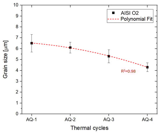 Refinement of austenite grains of AISI O2 during the thermal cycles from AQ-1 to AQ-4. The red dotted curve represents the polynomial fit.