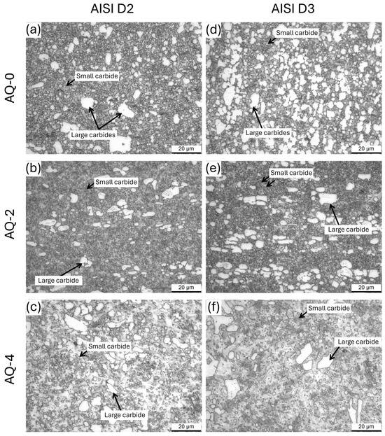 Microstructural evolution of both (a–c) AISI D2 and (d–f) AISI D3 steels (a,d) before and after the (b,e) AQ-2 and (c,f) AQ-4 thermal cycles.