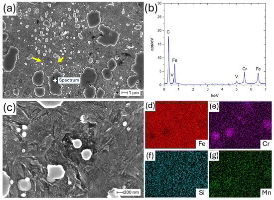 Figure 9a,c show high-magnification SEM micrographs of the AISI D3 microstructure in the AQ-4 state, highlighting the presence of large, irregularly shaped carbides (Figure 9a) as well as small spheroidized carbides (Figure 9a,c). The large carbides exhibit a chemical composition formed by Fe with alloying elements such as Cr and V. In the latter case, the relatively low V peak may be attributable to the signal originating from the matrix under the observed carbide. Figure 9a also reveals the presence of austenitic grain boundaries, as indicated by the yellow arrows. As extensively discussed by [,,], the presence of carbides, together with the relatively low austenitizing temperatures, contributes to hindering the coarsening of austenitic grains. Finally, Figure 9b shows the smallest carbides, which are visible at 60k× magnification, dispersed within a martensitic structure (as will also be discussed with XRD patterns). These small carbides can be attributable to Fe- and Cr-rich carbides, as confirmed by the EDS maps in Figure 9d,e. These statements are consistent with the resutls previously discussed in Figure 8 and with investigations made in [,,,]. Regarding the Si and Mn alloying elements (Figure 9f,g), they appear to be homogeneously distributed in the matrix.