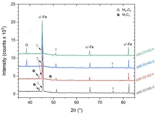 XRD patterns of both AISI D2 and AISI D3 tool steels after the AQ-2 and AQ-4 thermal cycles.