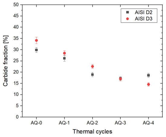 Variation in carbide fraction (%) in both AISI D2 and AISI D3 tool steels during the AQ thermal cycles.