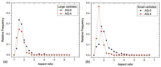 At the same time, multiple AQ cycles promoted carbide spheroidization. In fact, Figure 12 presents the distributions of the aspect ratio for large (Figure 12a) and small (Figure 12b) carbides before and after four AQ thermal cycles. As shown in Figure 12a, the curves shift slightly toward an aspect ratio of one, corresponding to a perfectly spherical morphology. This observation suggests that the AQ-4 condition promotes a moderate degree of spheroidization in the coarse carbides. In contrast, the four AQ cycles result in a more pronounced spheroidization of the finer carbides, as evidenced by the leftward shift in the red curve in Figure 12b toward lower aspect ratio values, as suggested in Figure 8.