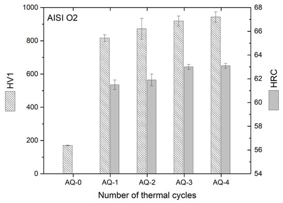 Variations in Vickers and Rockwell hardness of AISI O2 tool steels during the AQ thermal cycles.