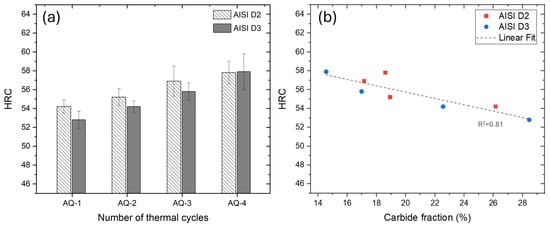 (a) Variation in Rockwell hardness measurements as a function of AQ thermal cycles. (b) Linear correlation (dotted line) between the carbide fraction (%) and the Rockwell hardness values (HRC).