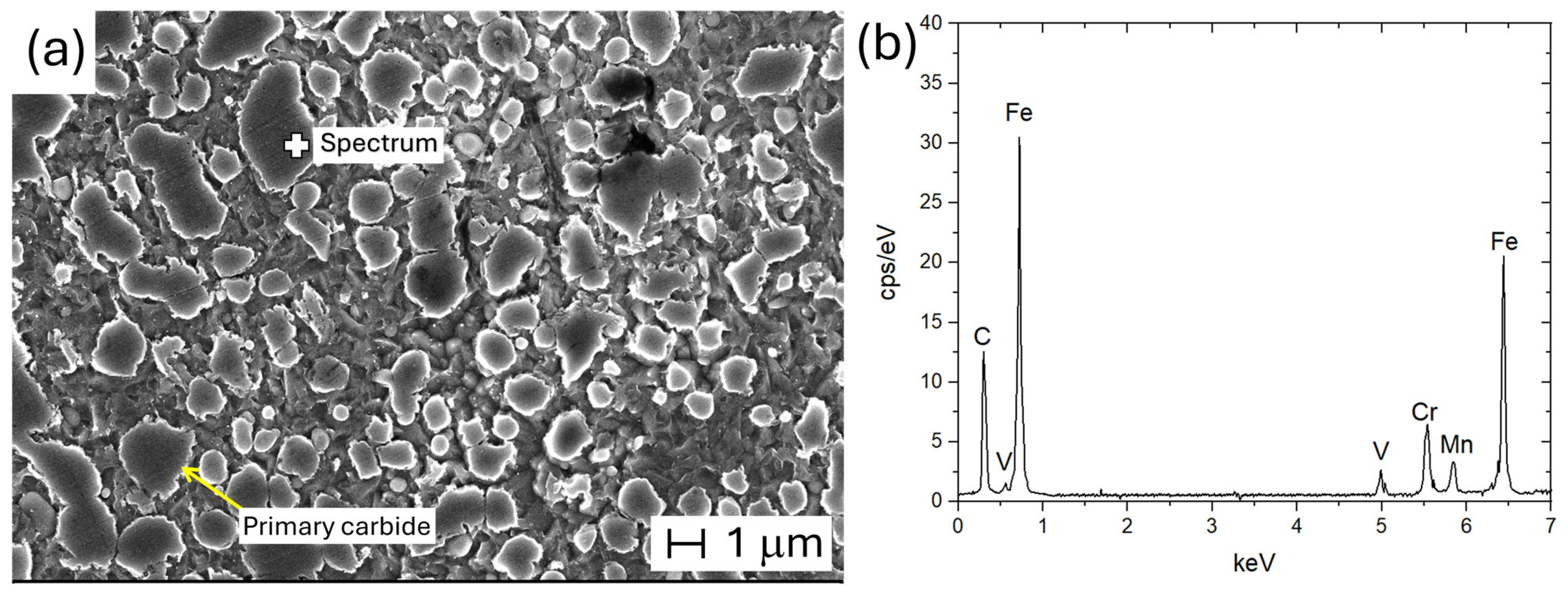 - Kim, H.; Kang, J.-Y.; Son, D.; Lee, T.-H.; Cho, K.-M. Evolution of Carbides in Cold-Work Tool Steels. Mater. Charact. 2015, 107, 376–385. [Google Scholar] [CrossRef]