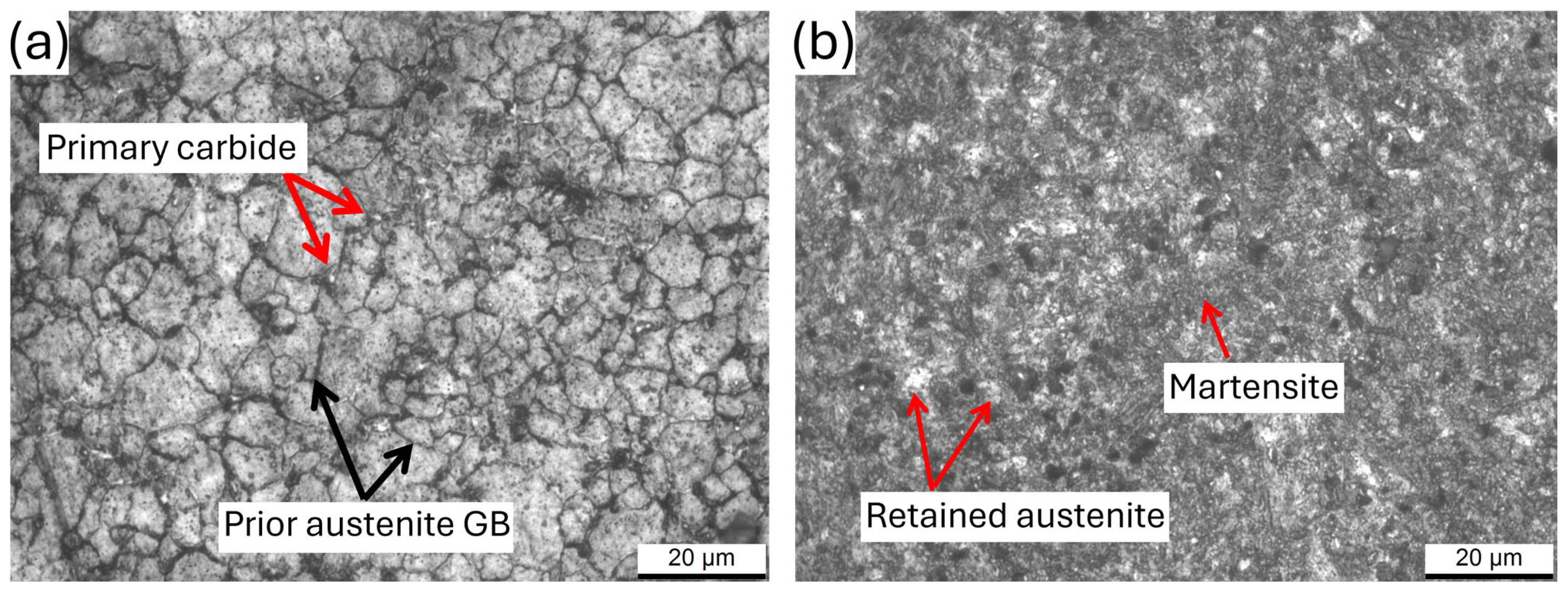 - Salunkhe, S.; Fabijanic, D.; Nayak, J.; Hodgson, P. Effect of Single and Double Austenitization Treatments on the Microstructure and Hardness of AISI D2 Tool Steel. Mater. Today Proc. 2015, 2, 1901–1906. [Google Scholar] [CrossRef]