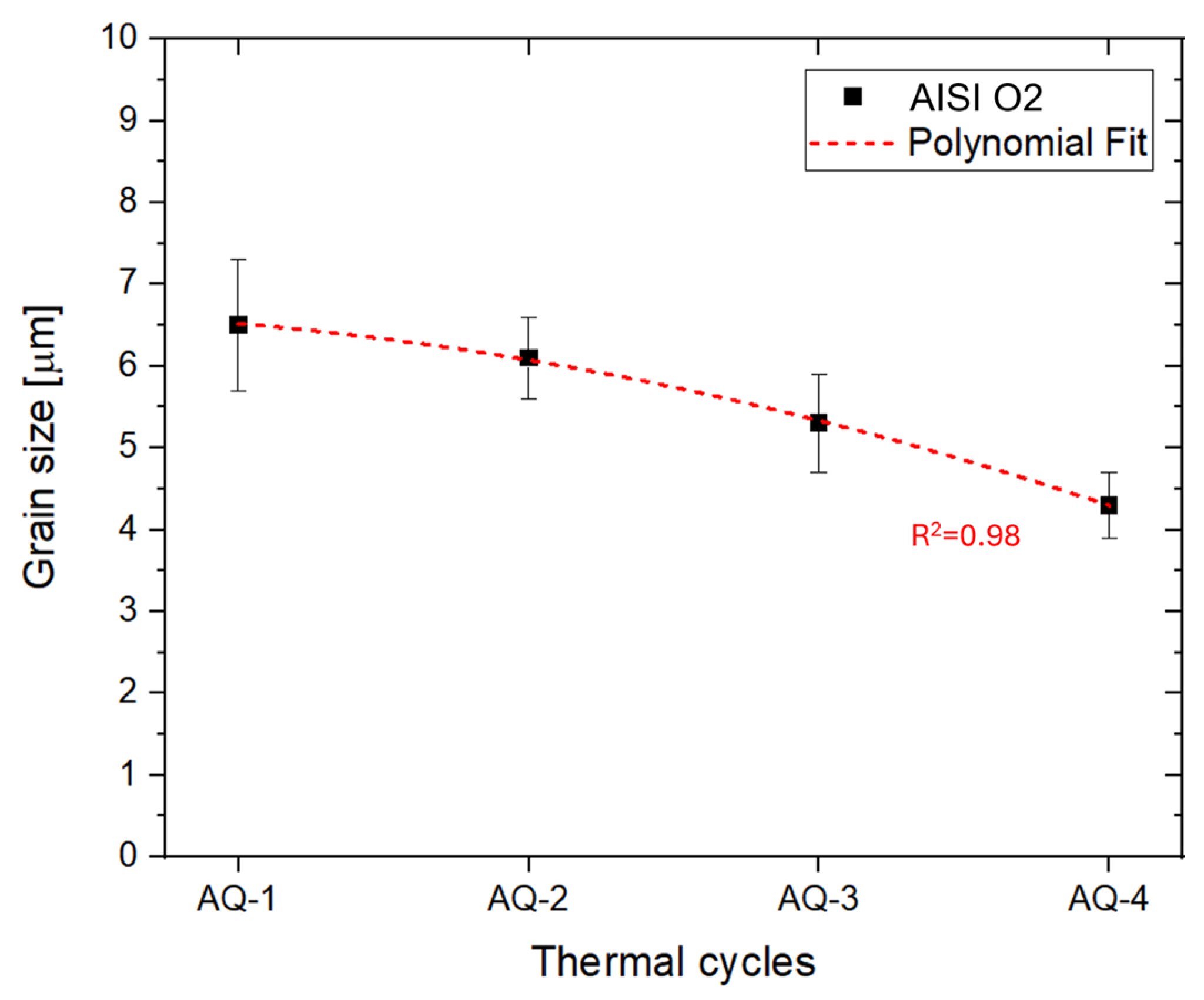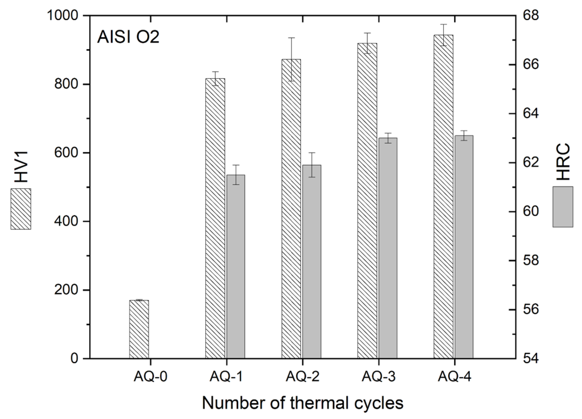 - Repeated AQ cycles promoted progressive grain refinement in AISI O2 steel, reducing the mean prior austenitic grain size from (6.5 ± 0.8) μm to (4.3 ± 0.4) μm. This refinement, combined with carbide dissolution (after AQ-2), martensite formation, and a reduction in retained austenite, resulted in a continuous hardness increase up to ~ 950 HV1 (63 HRC).