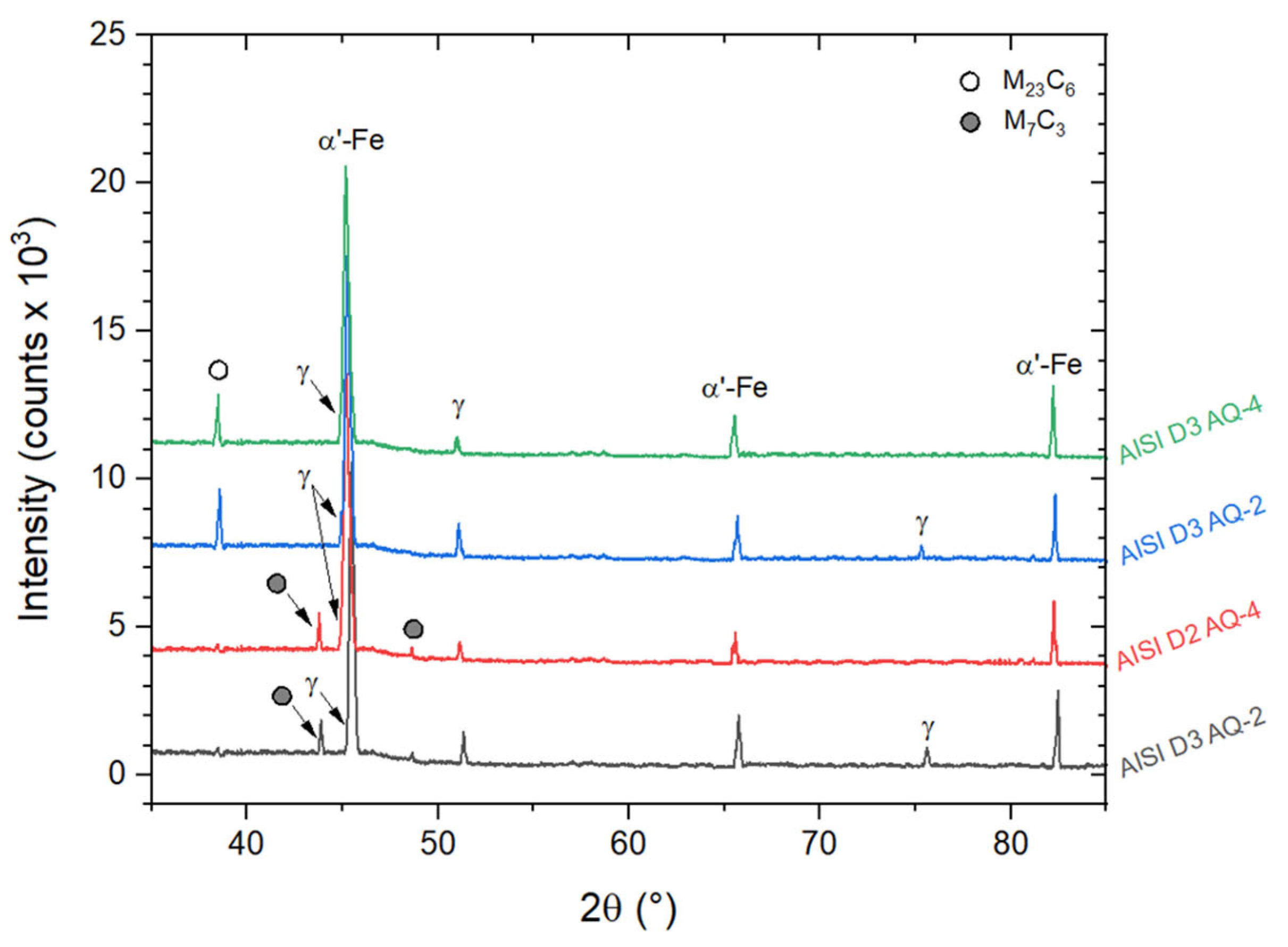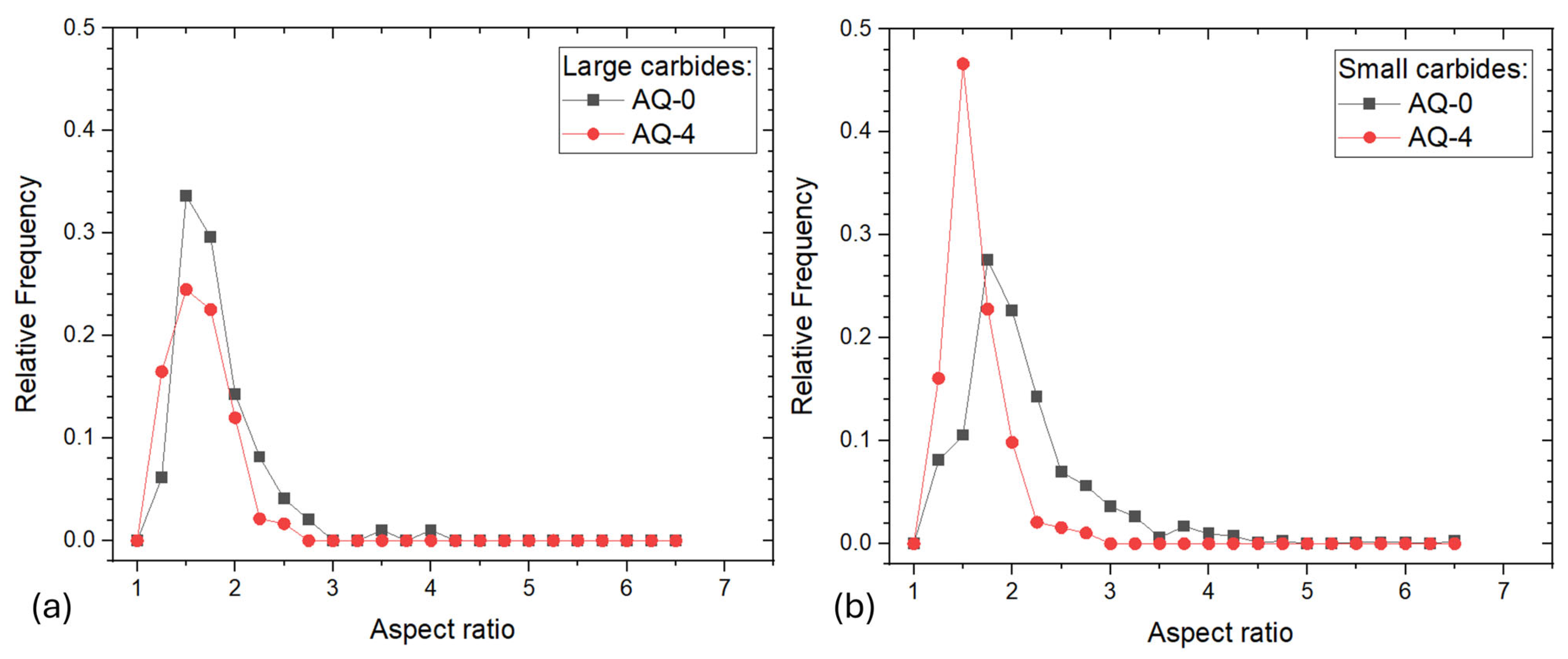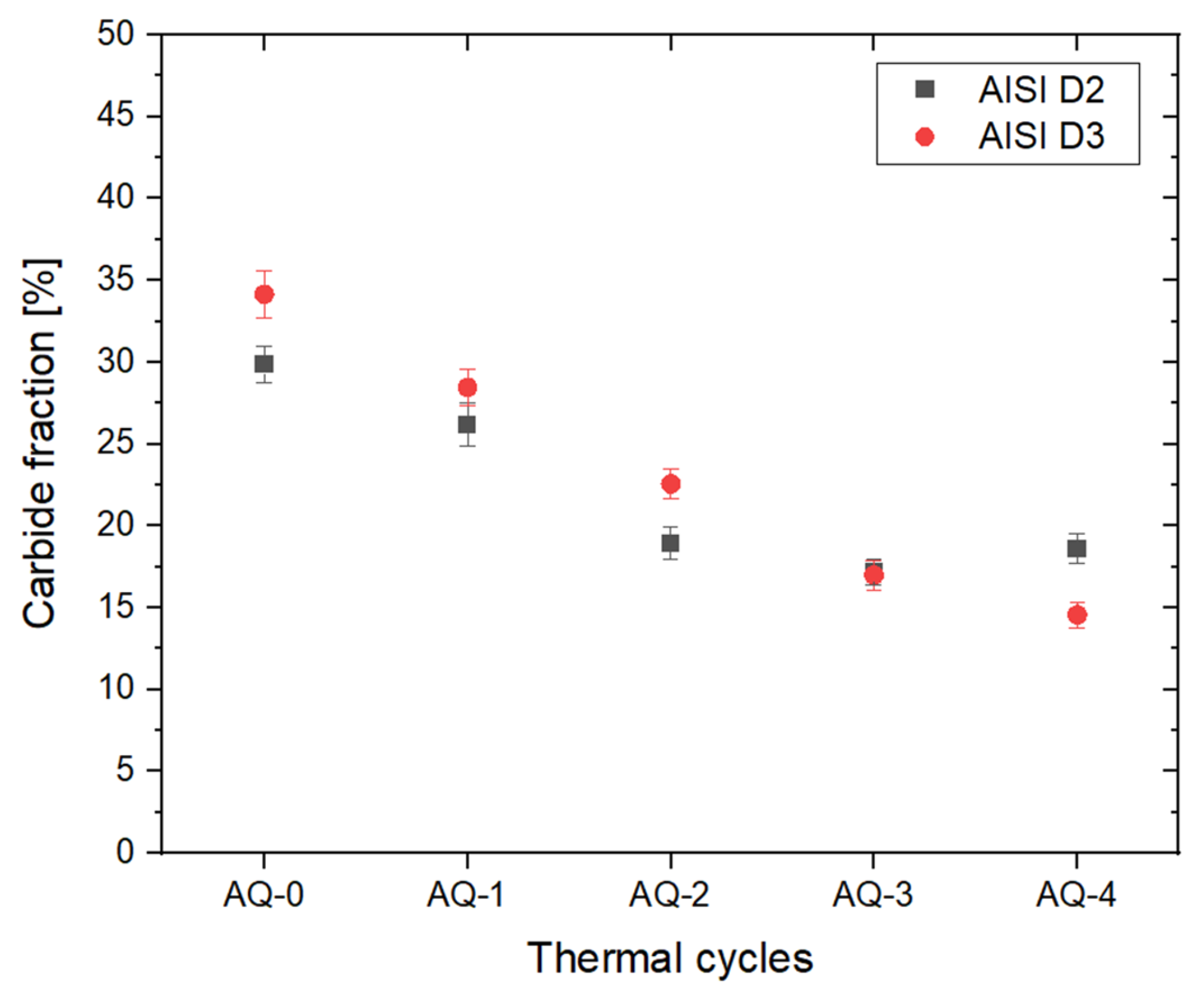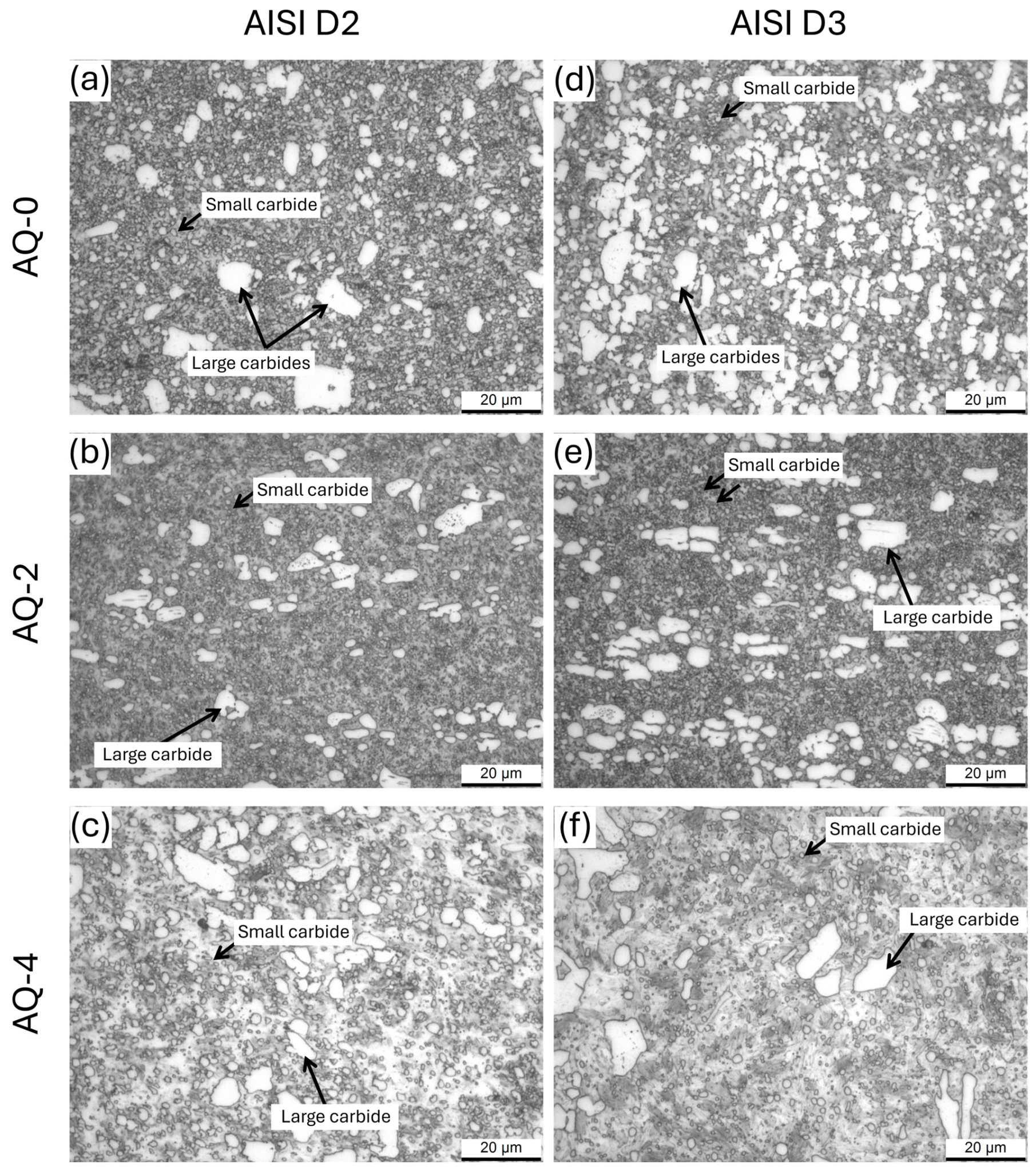 - In AISI D2 and D3 steels, the AQ treatments induced both carbide dissolution and their spheroidization. In AISI D2, partial coarsening was observed after AQ-3, likely due to the complete dissolution of the smallest carbides, while AISI D3 exhibited a monotonic reduction in both the size and volume fraction of the M23C6 carbides.