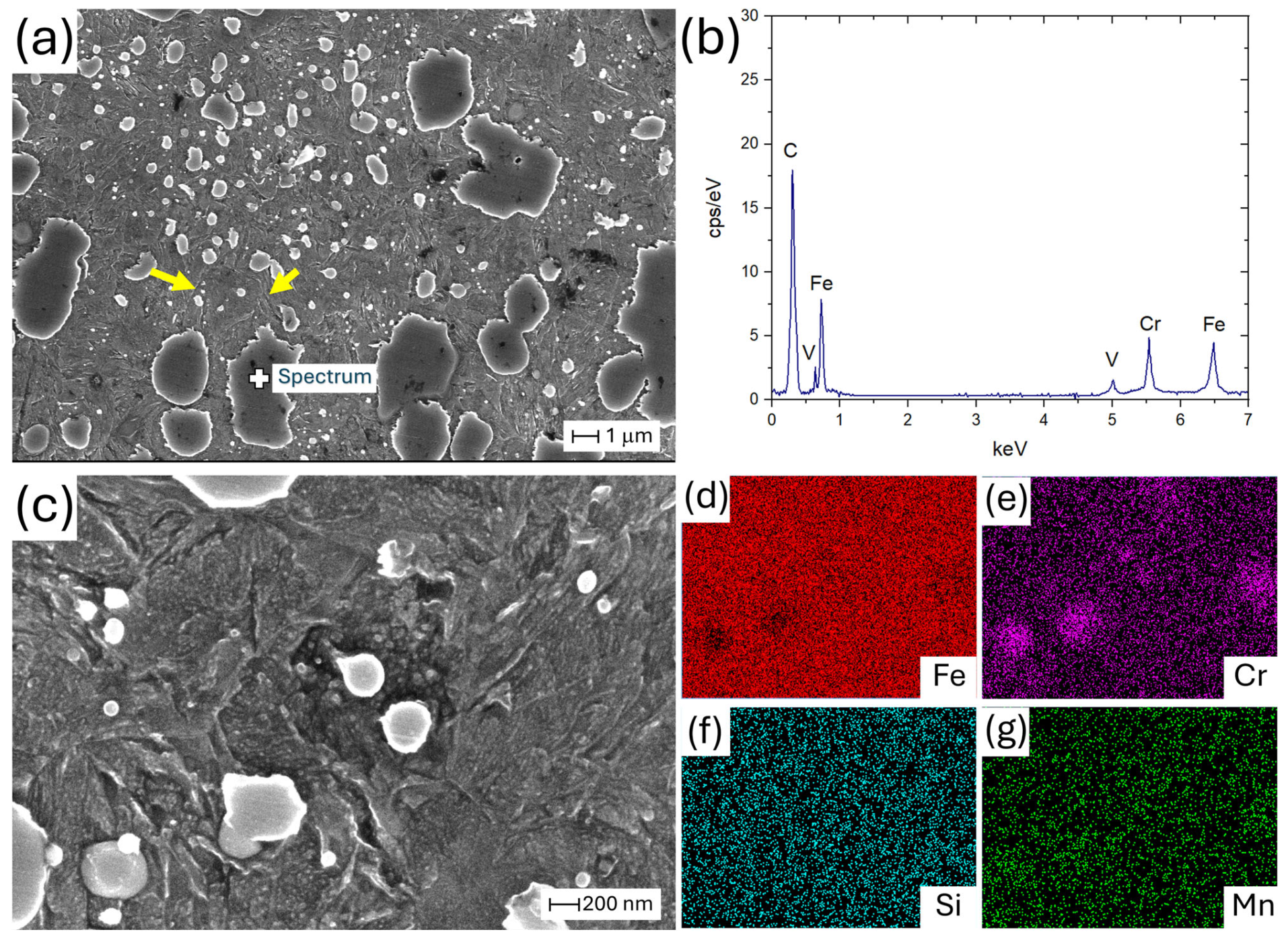 - Su, S.; Song, R.; Quan, S.; Li, J.; Wang, Y.; Cai, C.; Wen, E. A Fe-Cr-C Steel Based on Gradient Scale Precipitation Hardening: Hardening and Toughening Mechanism of Multistage Heat Treatment. J. Alloys Compd. 2023, 946, 169355. [Google Scholar] [CrossRef]