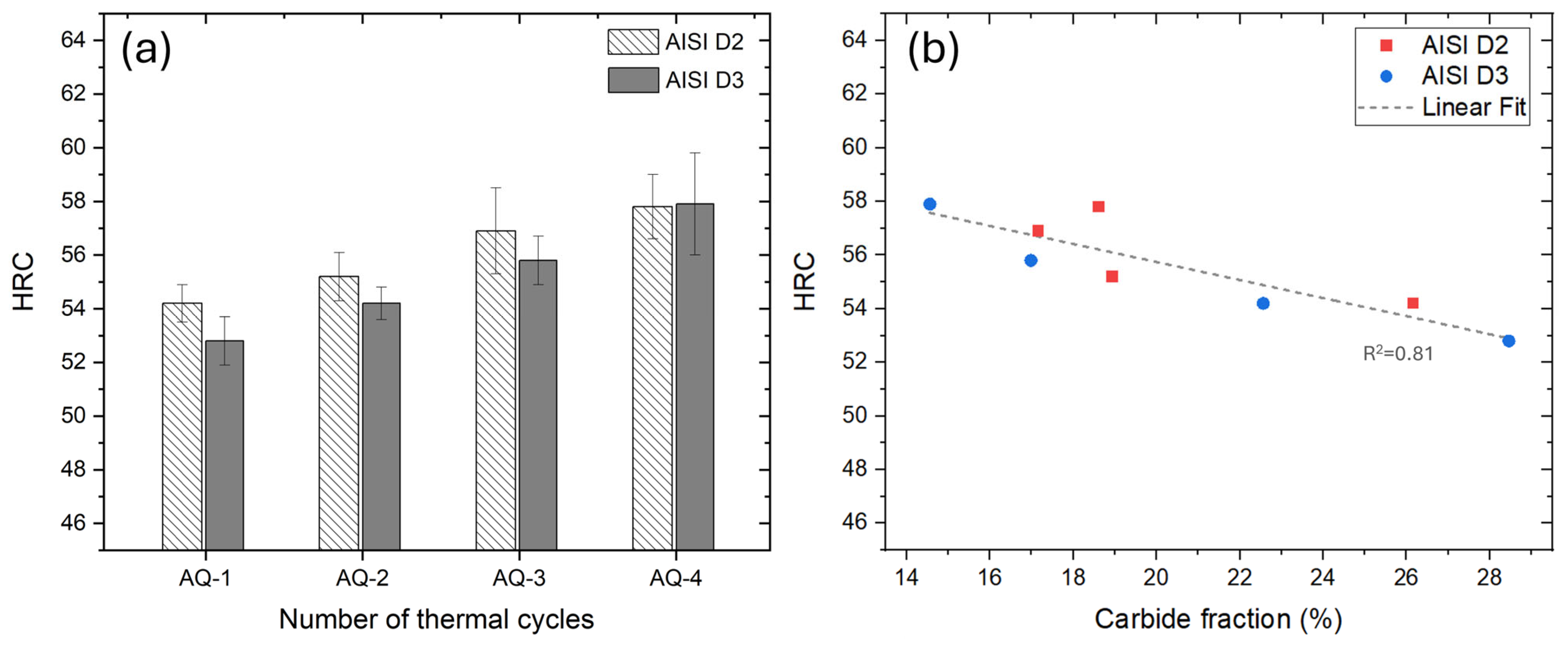 - A linear correlation was established between carbide dissolution and the hardness for both D2 and D3 steels. Increased carbide dissolution enhanced the matrix’s hardness, leading to a Rockwell hardness of ~58 HRC.