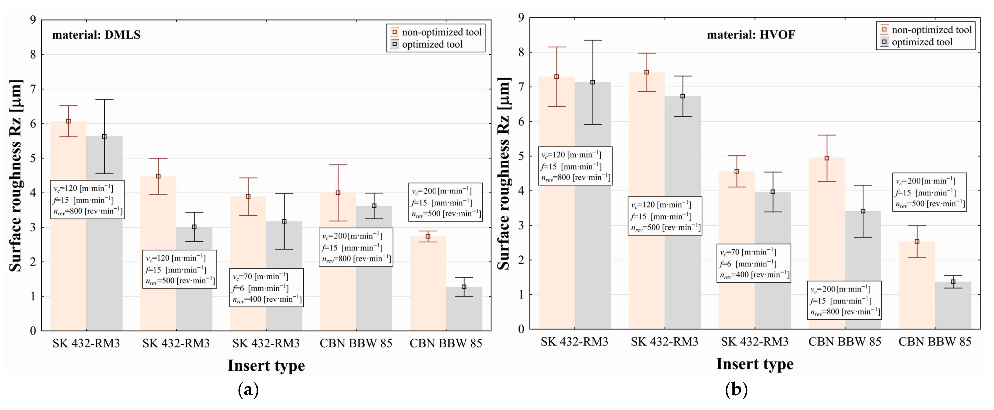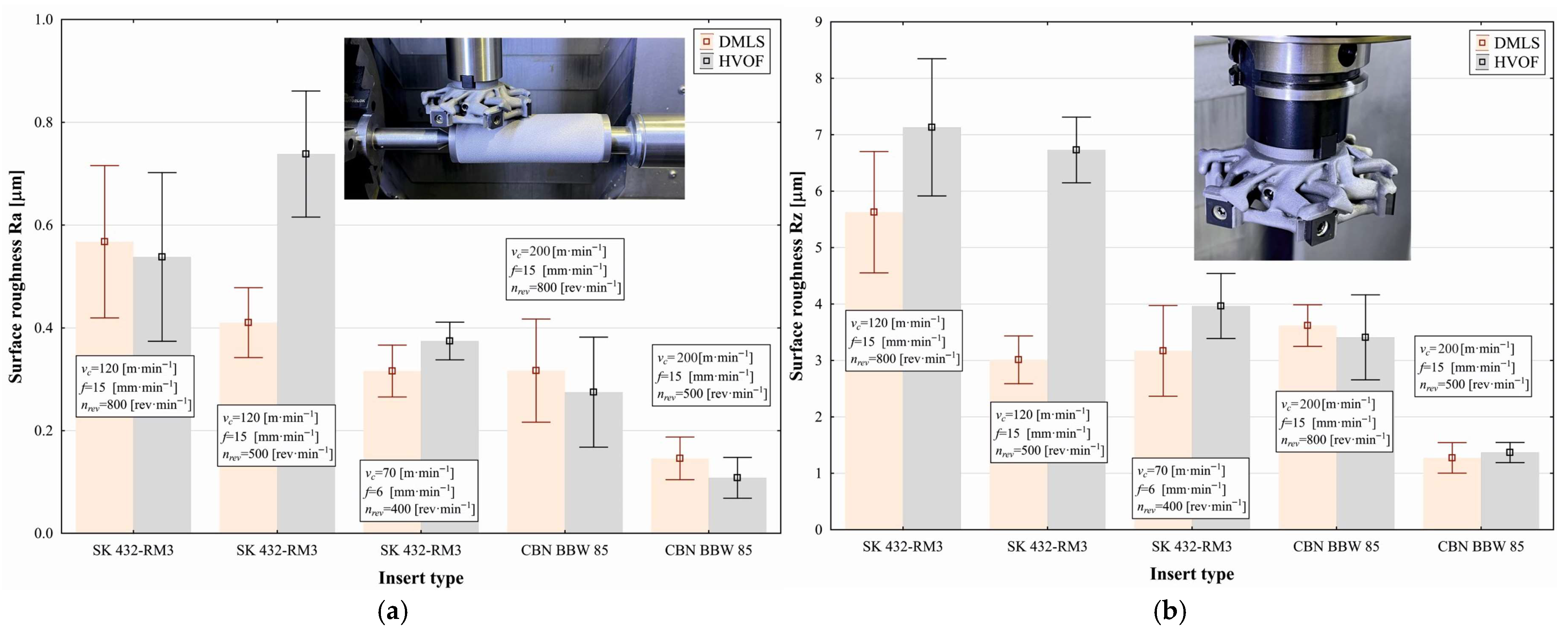Figure 7b), significant differences in the mean Rz values were observed only when machining with the tool fitted with carbide inserts (SK 432-RM3). In all cases, higher Rz values were obtained for Inconel 718 produced by the HVOF method. The maximum difference in Rz (3.718 ± 0.360;