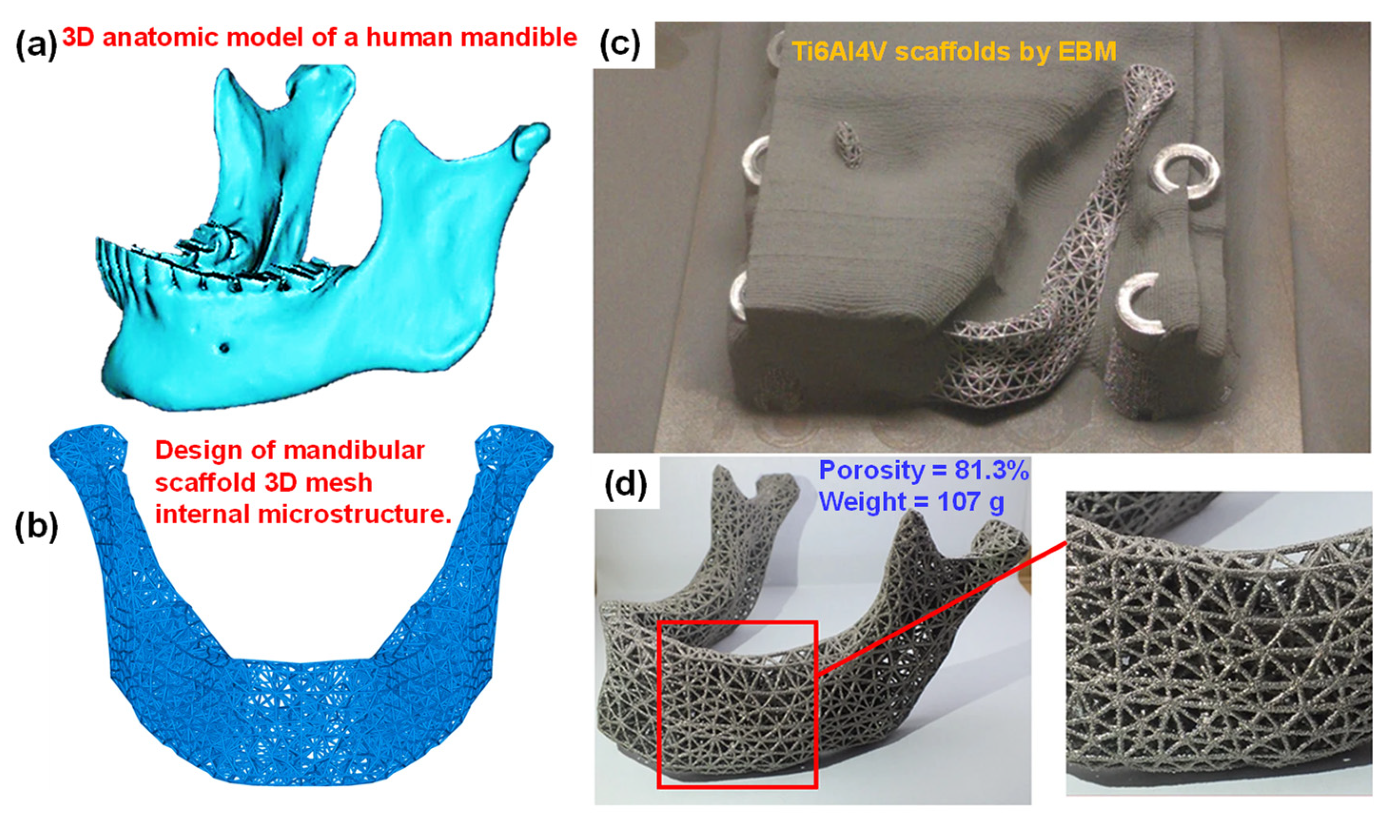 - Yan, R.; Luo, D.; Huang, H.; Li, R.; Yu, N.; Liu, C.; Hu, M.; Rong, Q. Electron Beam Melting in the Fabrication of Three-Dimensional Mesh Titanium Mandibular Prosthesis Scaffold. Sci. Rep. 2018, 8, 750. [Google Scholar] [CrossRef]
